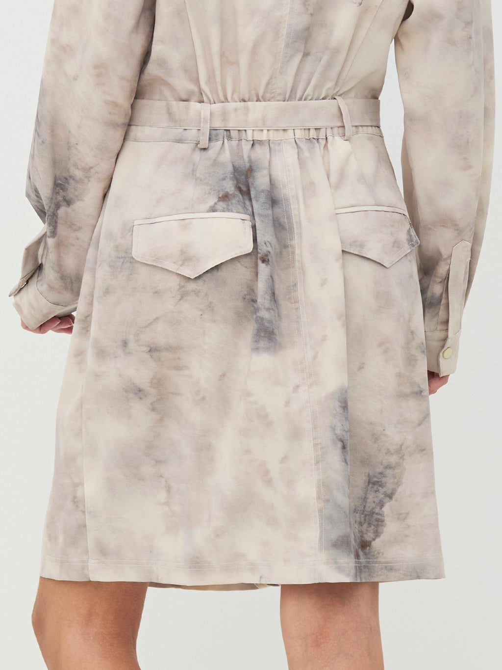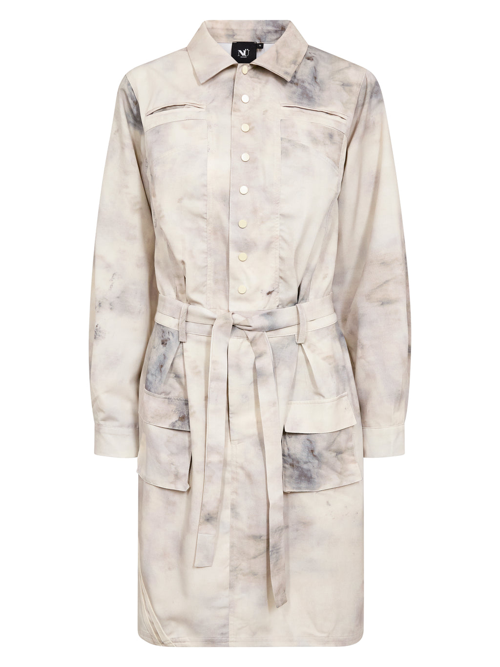 The dress features a classic shirt collar and button closure at the front. The buttons are placed at the chest and serve as a decorative detail, while the dress is worn closed. The front has chest pockets and a waistband that allows for adjusting the silhouette. The back is simple with discreet pocket details. Style the dress with boots for a more edgy look for everyday wear, or with flat shoes for a calmer look.