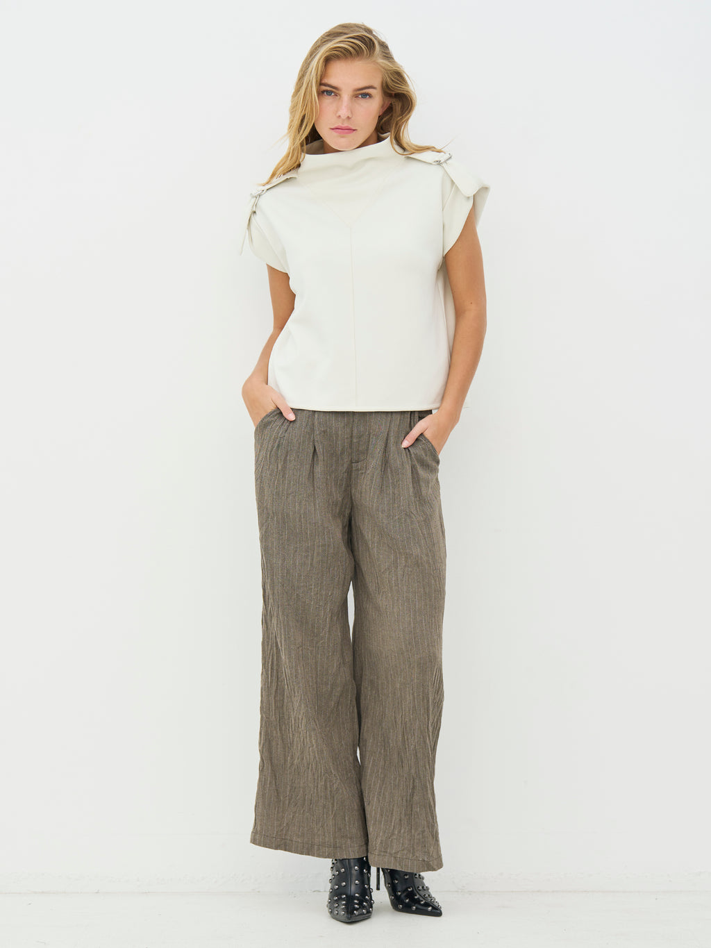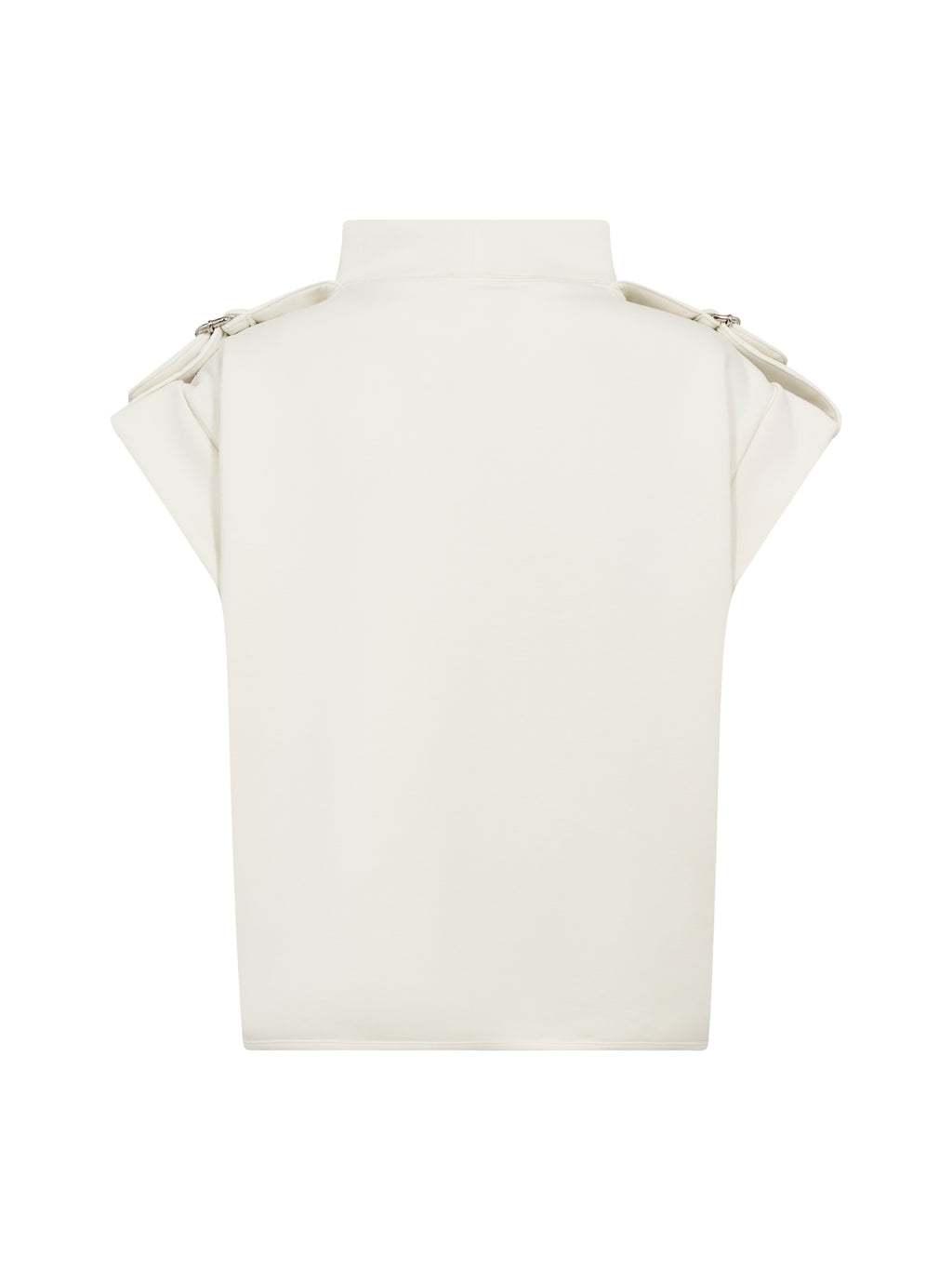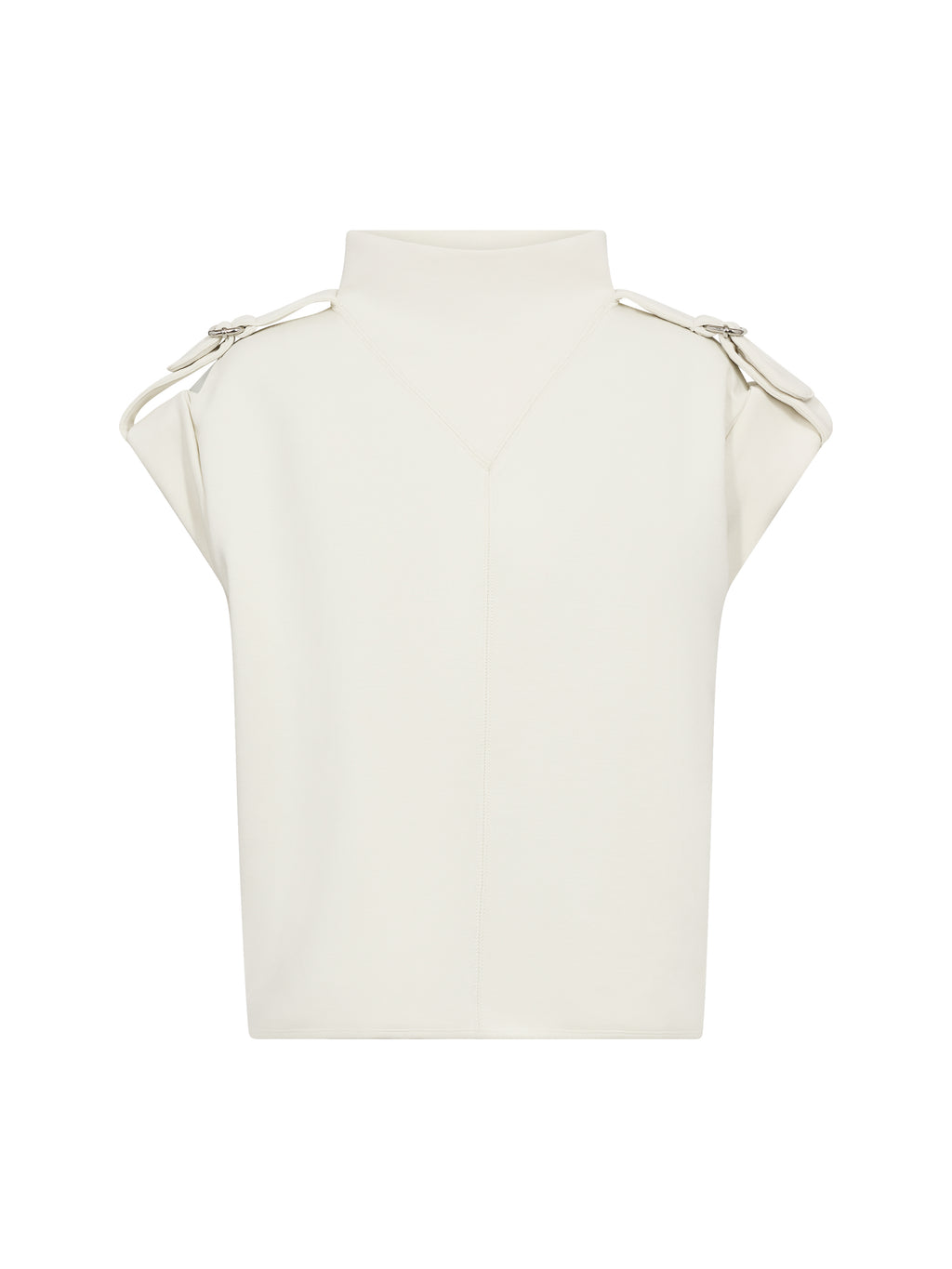 This top has a simple and modern expression with a high neck and a straight fit. The material is soft and stretchy, making it comfortable to wear and easy to move in. The small buckles on the shoulders serve as a decorative detail and give the top a subtle, raw twist. The back is simple and falls nicely. Style the top with the matching trousers for days at home or everyday wear.