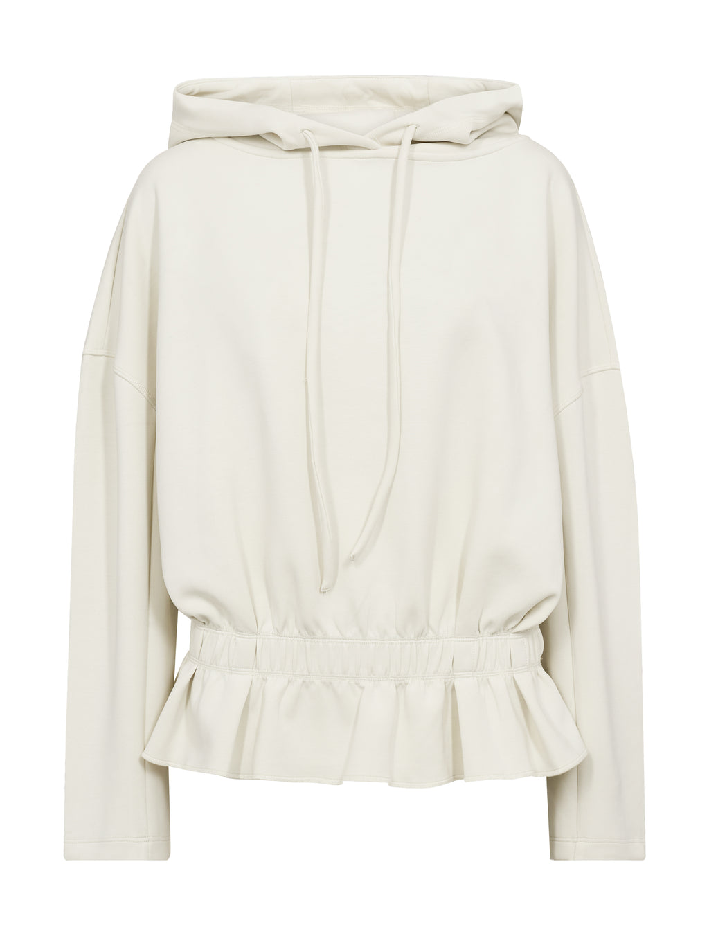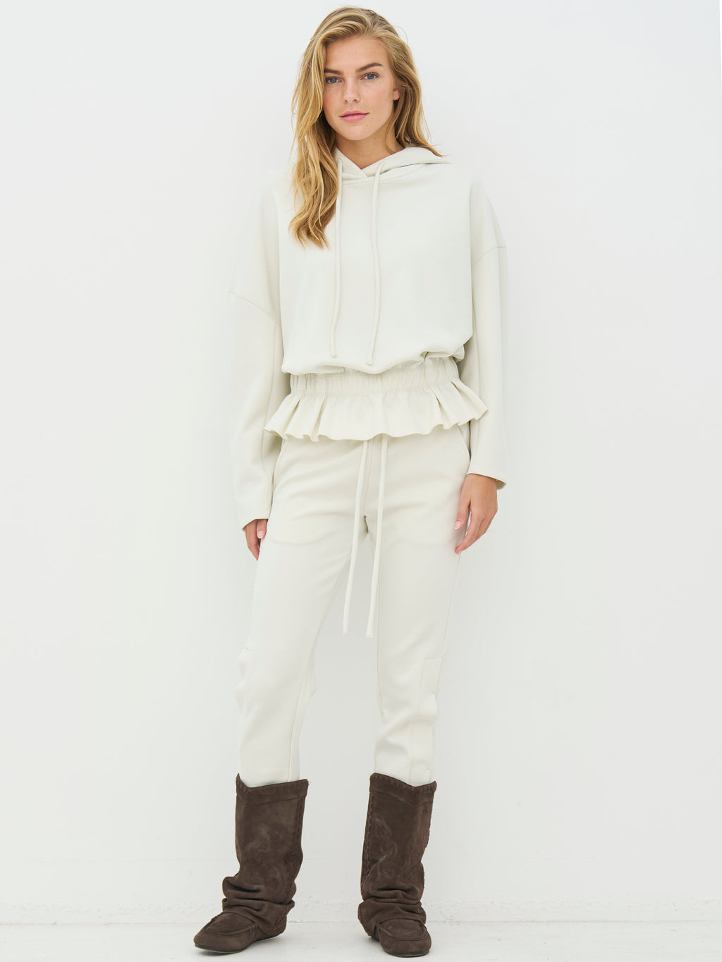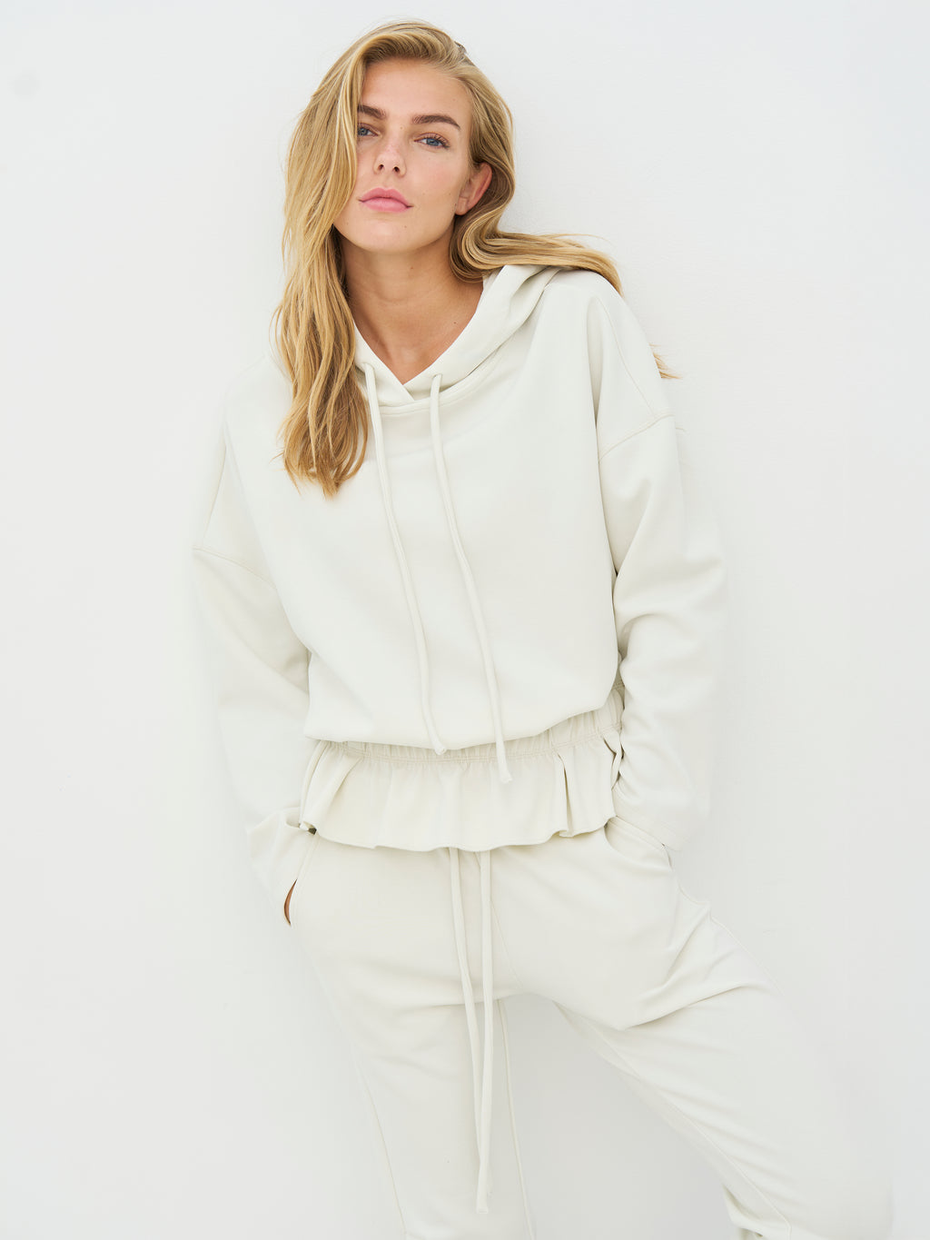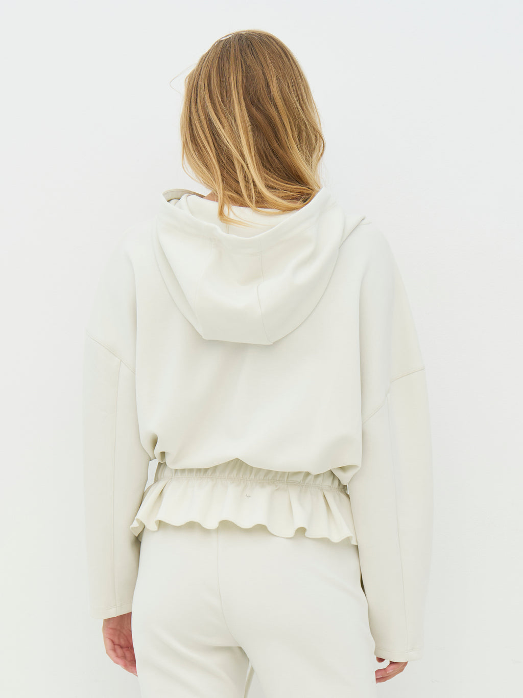 This hoodie has a relaxed and feminine expression with a hood and drawstring that gives a casual look. The light ruffle at the waist creates a nice contrast to the otherwise simple design and provides some shape without being tight. The sleeves are long and comfortable, and the fit is spacious, making it easy to wear daily. Pair the hoodie with the matching pants for a complete set, or style it with jeans or leggings for a casual look.