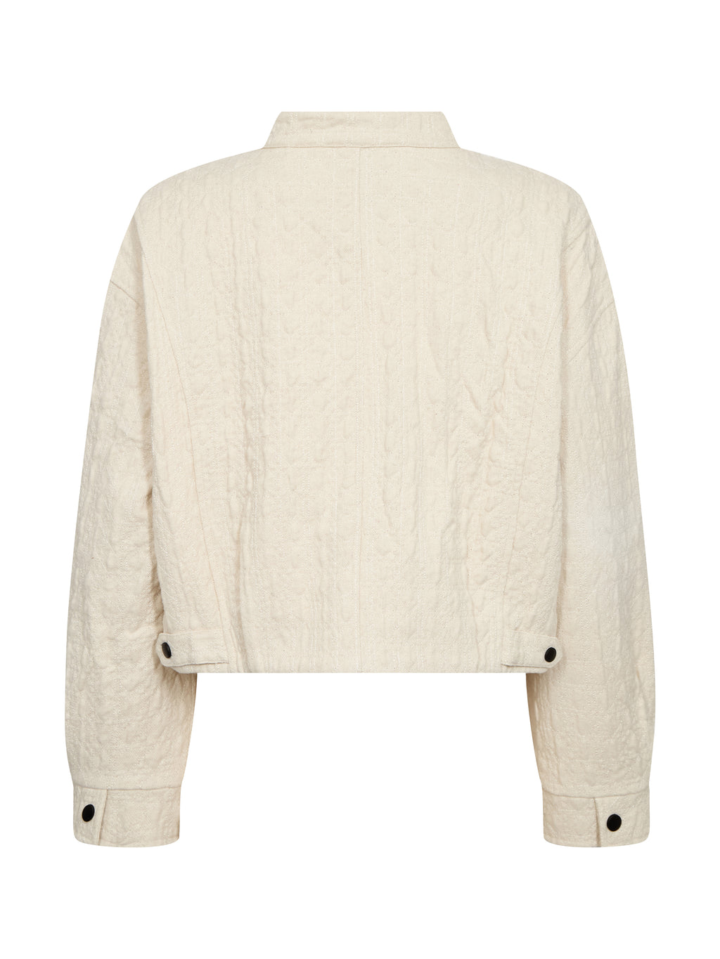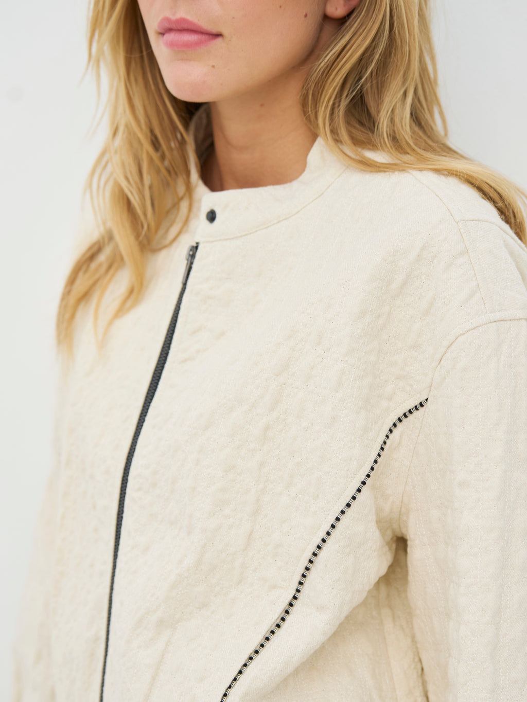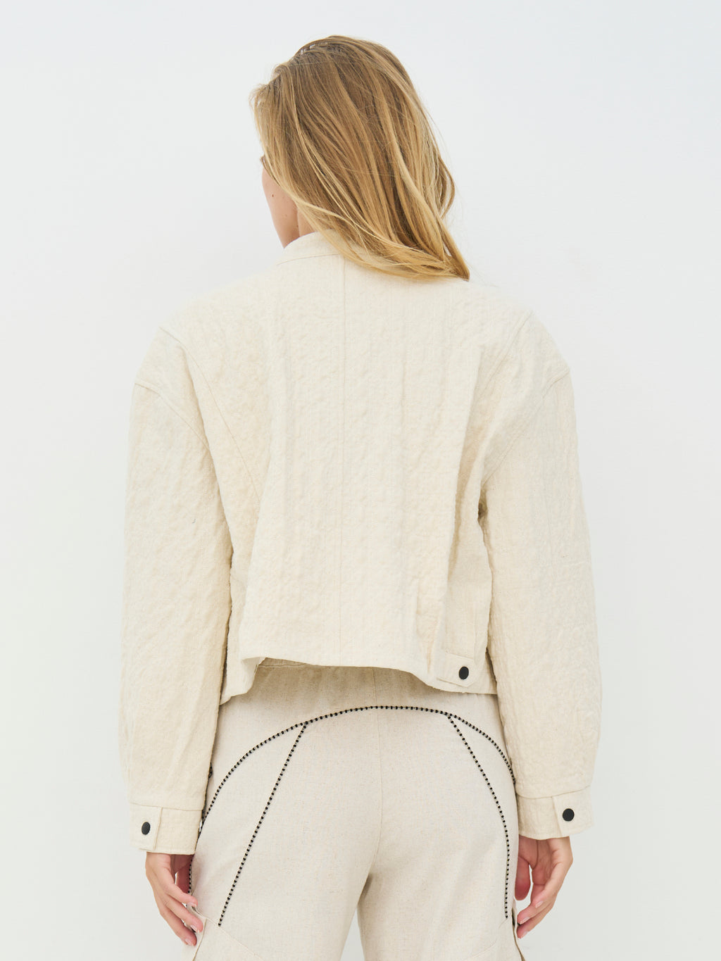 This short jacket has a raw and modern look with a straight fit and a front zipper. The high collar gives a clean look, while the visible seams along the sides add edge and character. The sleeves are long and end with cuffs and snaps, giving a cool look. The back of the jacket is simple, falling straight down. The jacket works well as a light layer and can be styled with the matching pants for a coordinated set or worn over a dress or top for everyday use.