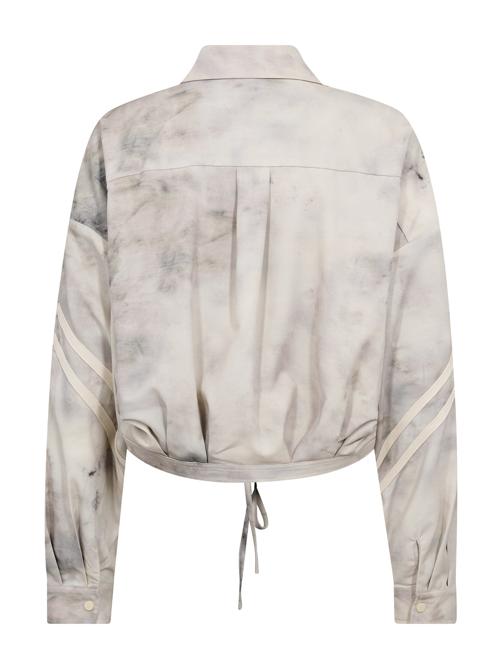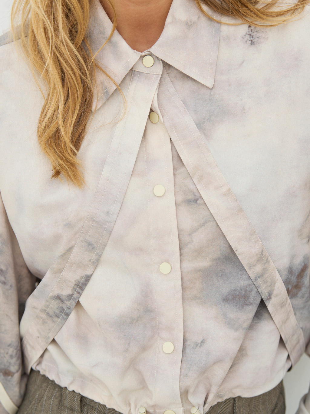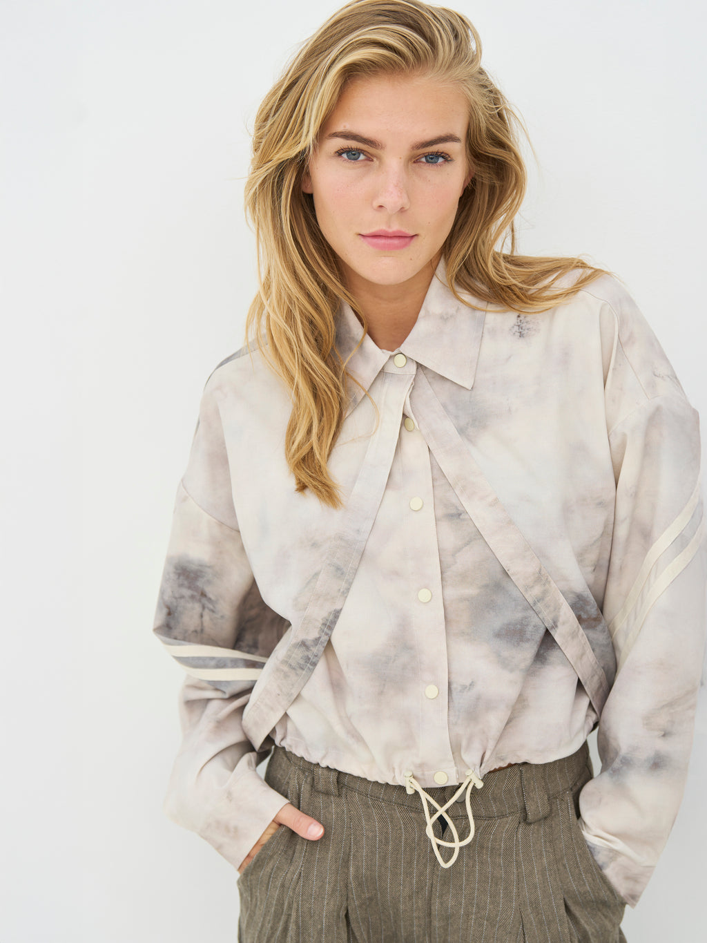 This shirt has a relaxed and slightly raw look with its light marbled pattern and short length. The classic shirt collar and button closure at the front give it a recognizable appearance, while the prominent cuts and lines on the front and sleeves add edge and structure. The drawstring at the bottom allows for adjusting the fit and gives the shirt a more relaxed shape. The back is kept simple and falls lightly over the back. Pair it with the matching trousers for a coordinated set, or style it with plain trousers to emphasize the jacket's details even more. Front button closure - Adjustable drawstring at the bottom - Striking cuts and lines