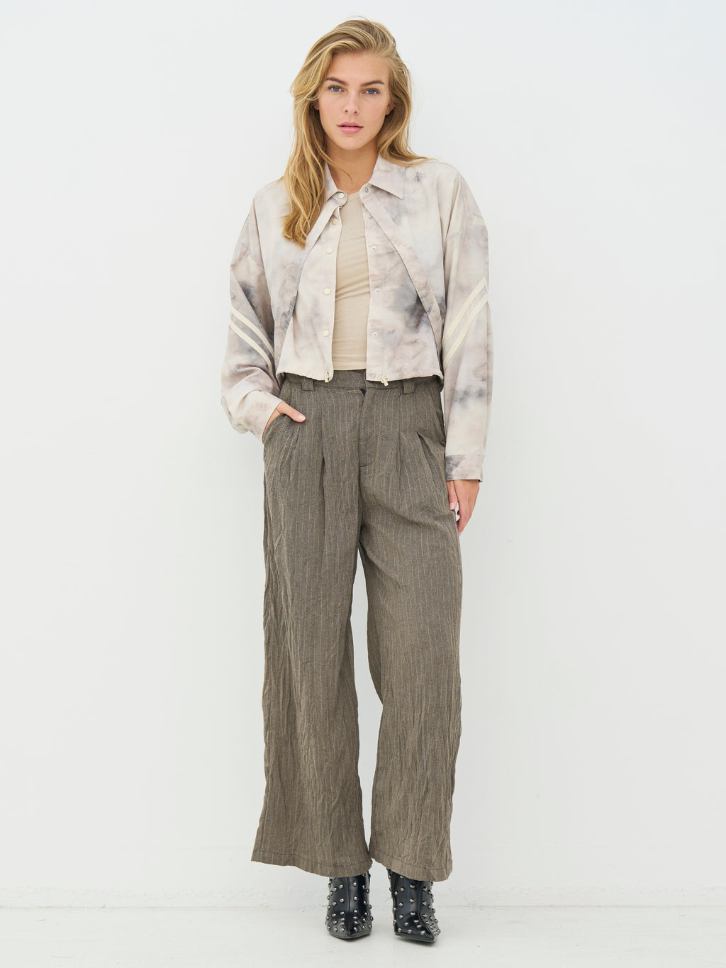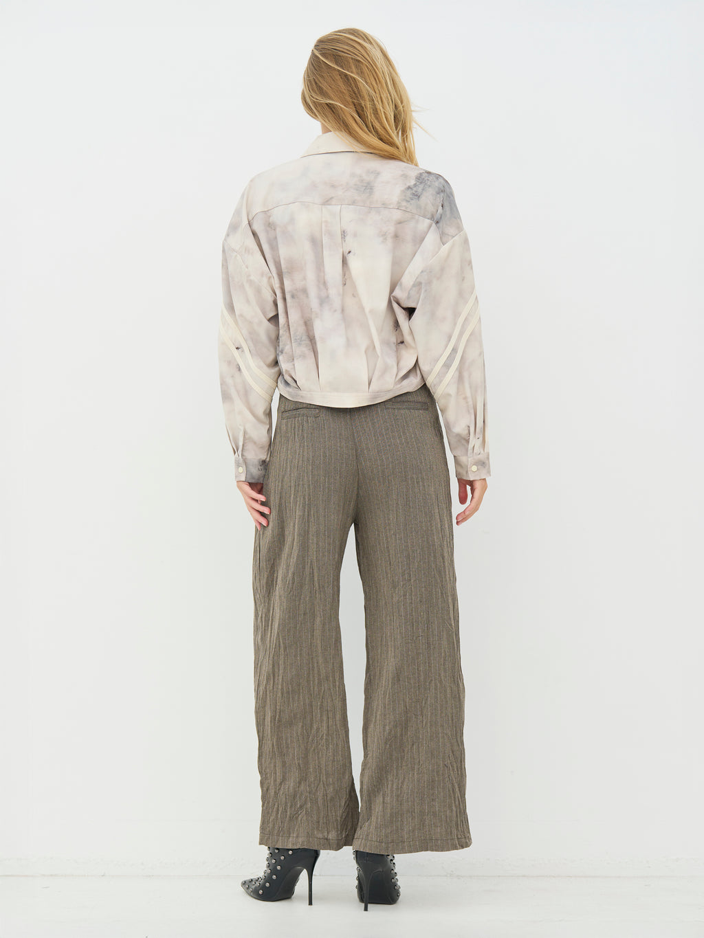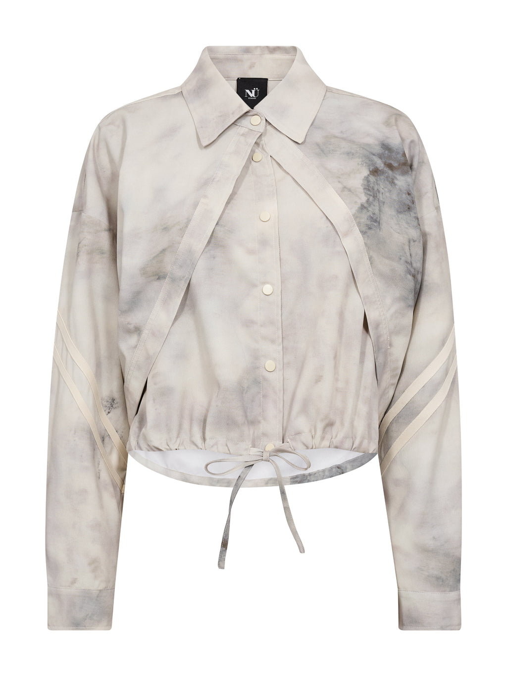 This shirt has a relaxed and slightly raw look with its light marbled pattern and short length. The classic shirt collar and button closure at the front give it a recognizable appearance, while the prominent cuts and lines on the front and sleeves add edge and structure. The drawstring at the bottom allows for adjusting the fit and gives the shirt a more relaxed shape. The back is kept simple and falls lightly over the back. Pair it with the matching trousers for a coordinated set, or style it with plain trousers to emphasize the jacket's details even more. Front button closure - Adjustable drawstring at the bottom - Striking cuts and lines
