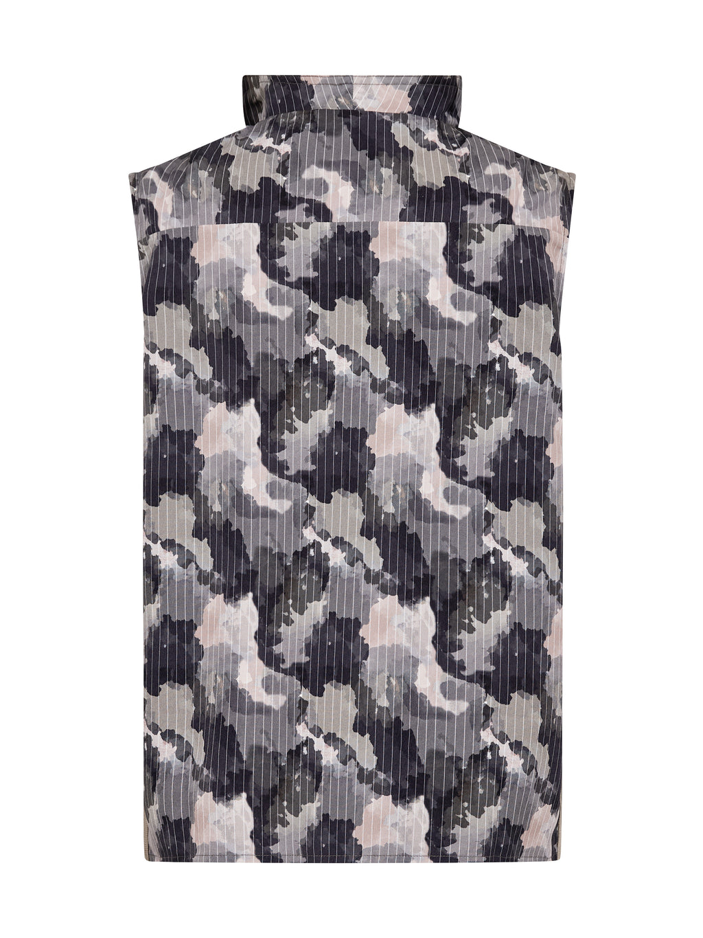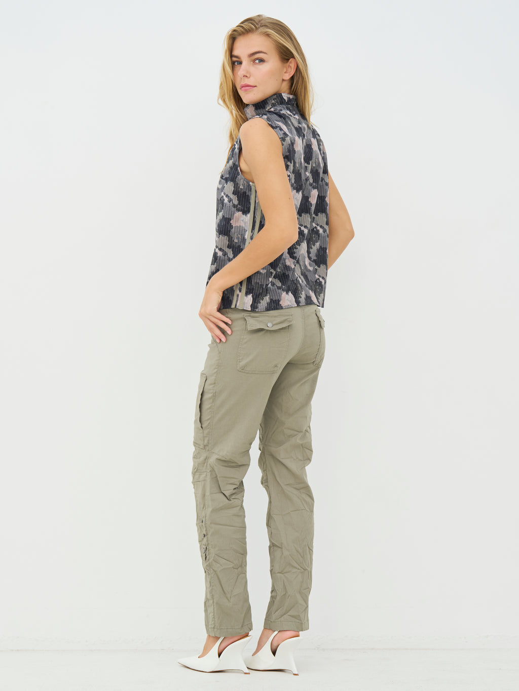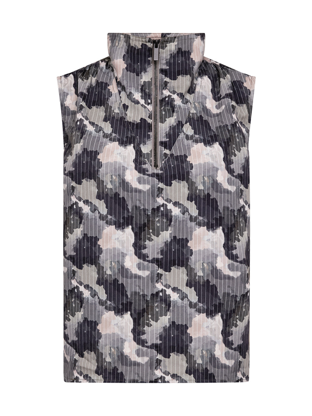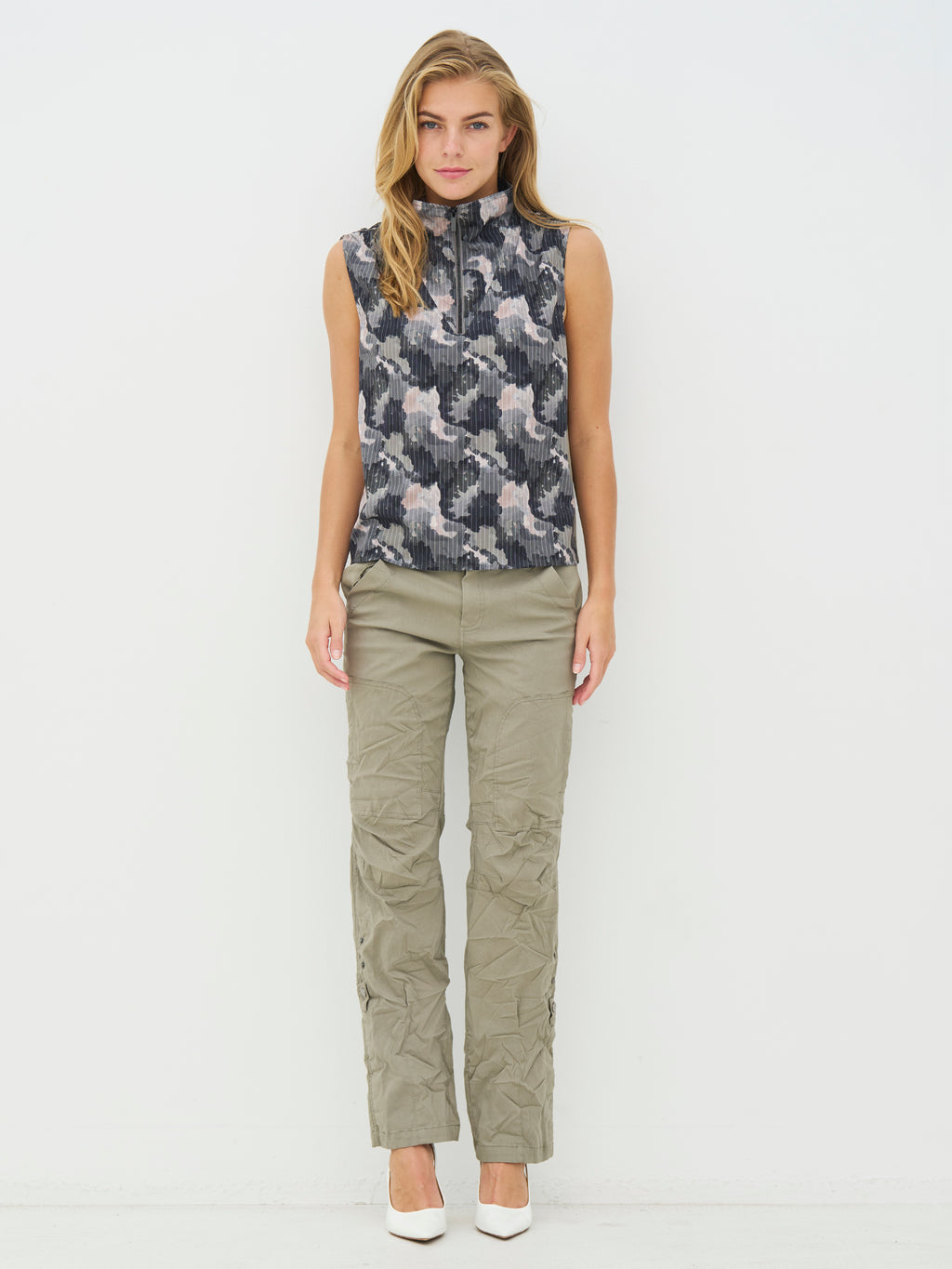 This top has a relaxed and modern look with a straight fit and high neckline that closes with a short zipper at the front. The front is kept calm, while the cut at the neckline creates a nice V-shape, adding a subtle edge. The fabric falls softly, making the top comfortable to wear, and the back is simple and without details. Pair it with the matching trousers for a complete set, or style it with jeans or shorts for a casual everyday look.