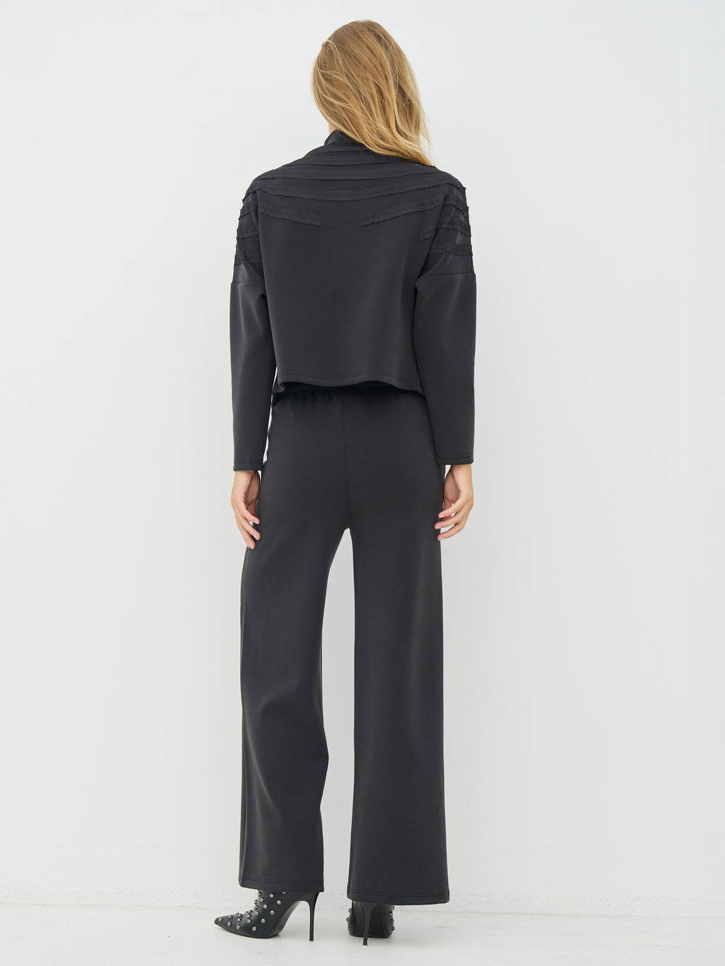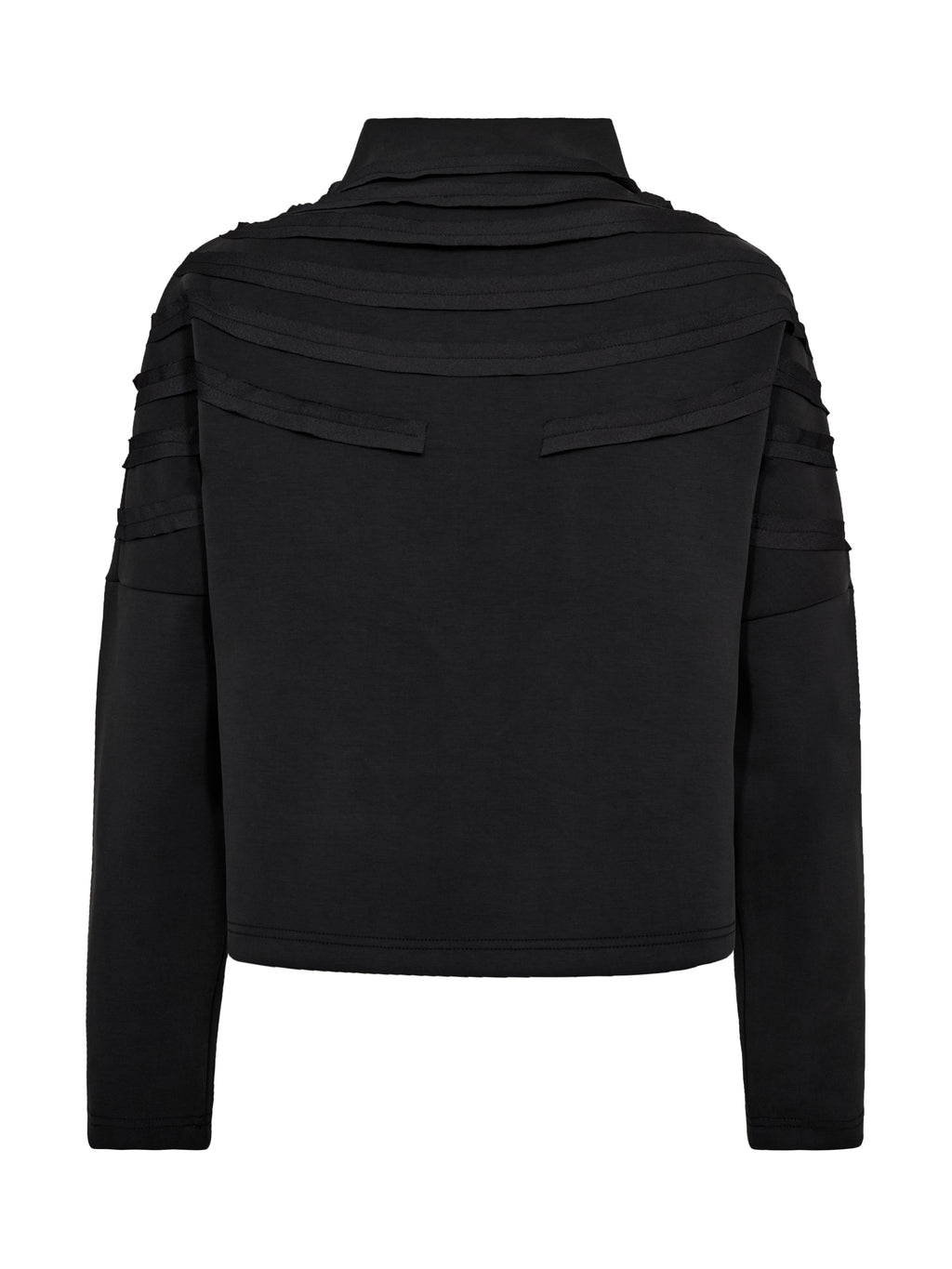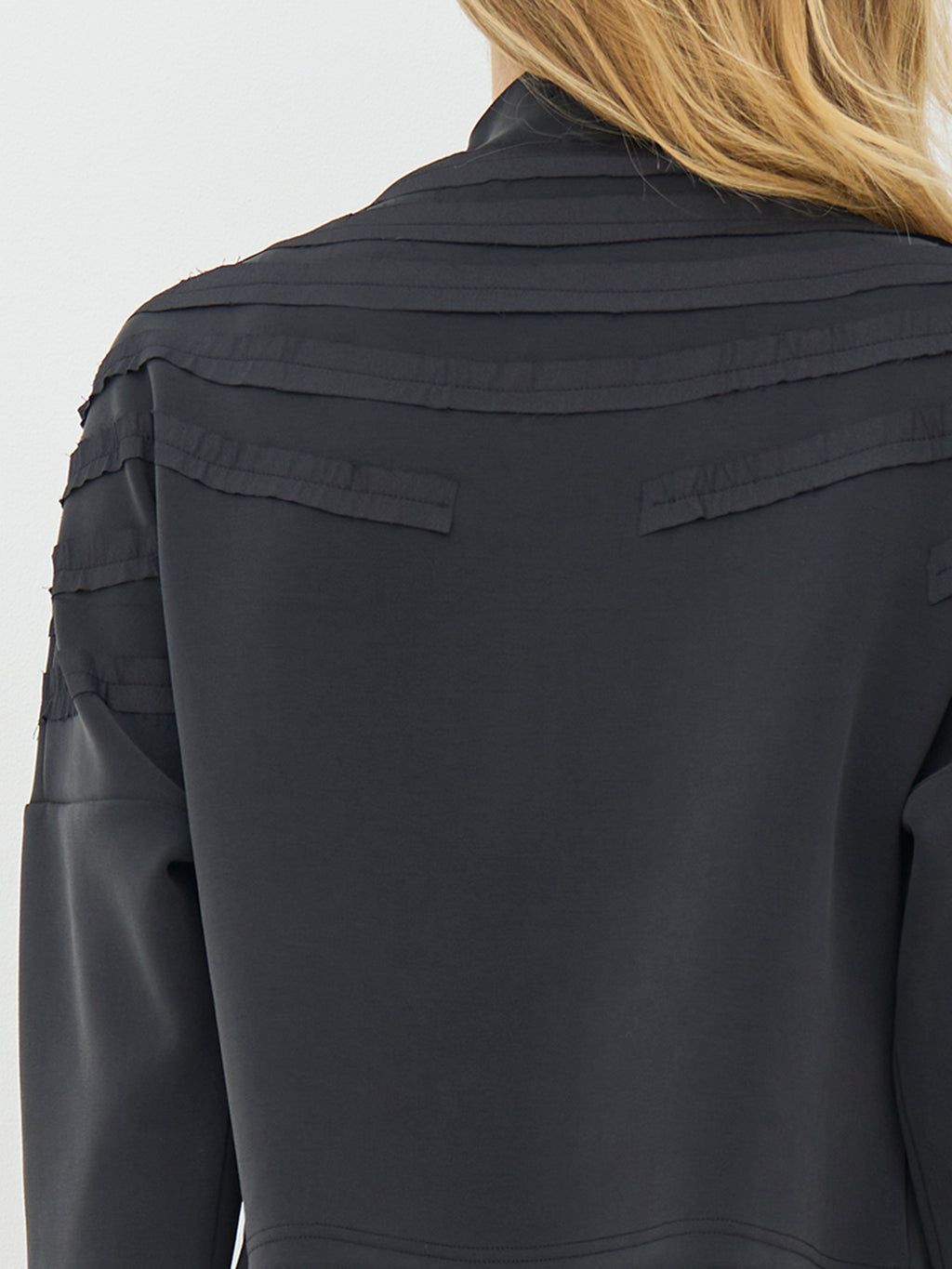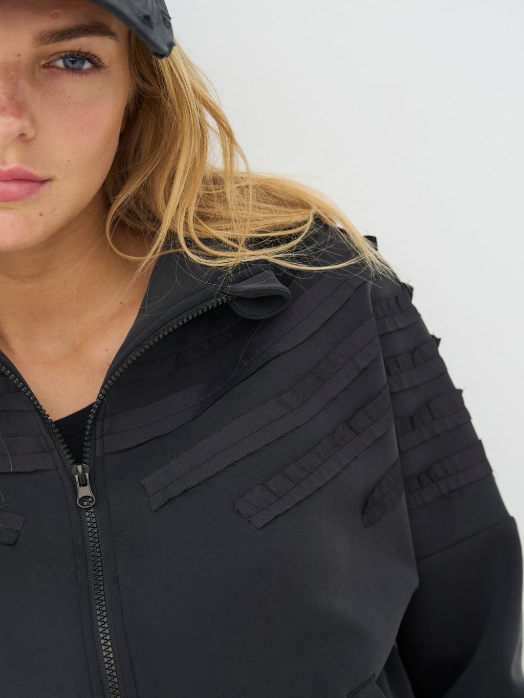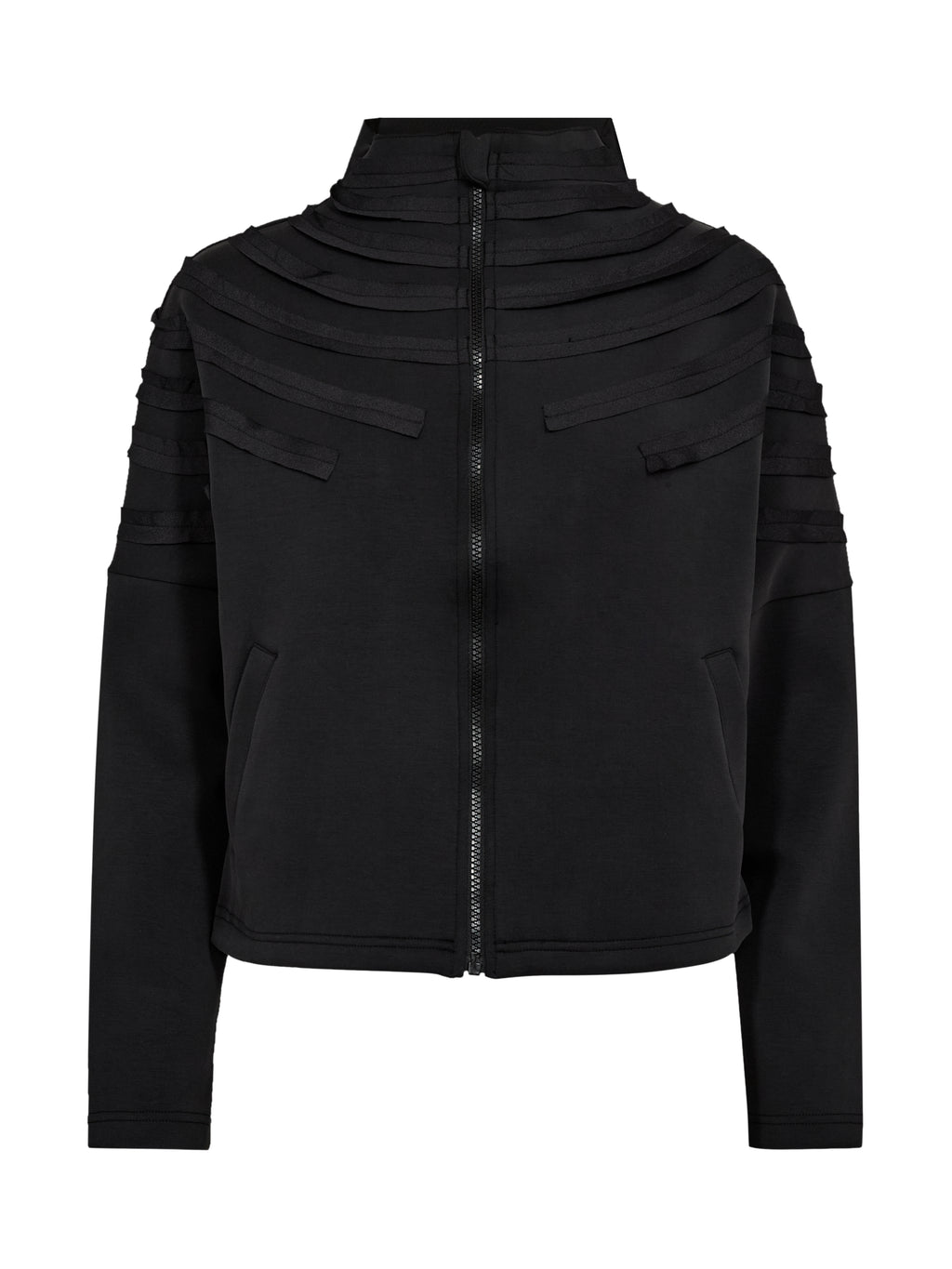 This jacket has a relaxed and clean look with a straight fit and a full front zipper. The front is characterized by decorative ribbons that lay in soft, curved lines creating a subtle 3D effect, while the back is simpler and calmer in expression. The jacket is comfortable to wear and works well as a light layer for everyday use. Style it with the matching trousers for a coordinated look, or wear it over a simple top for a casual outfit.