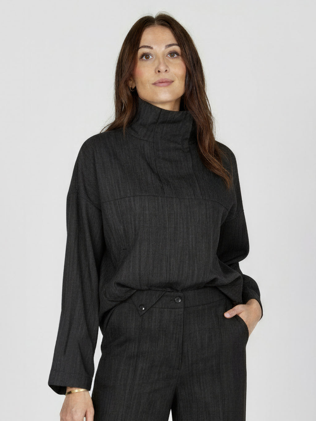 This top combines a structured material with a simple yet refined design. It features a high collar with a short zipper, wide sleeves, and a light boxy cut, which creates a relaxed yet well-dressed silhouette. The back follows the same simple expression as the front, making it easy to style across seasons.