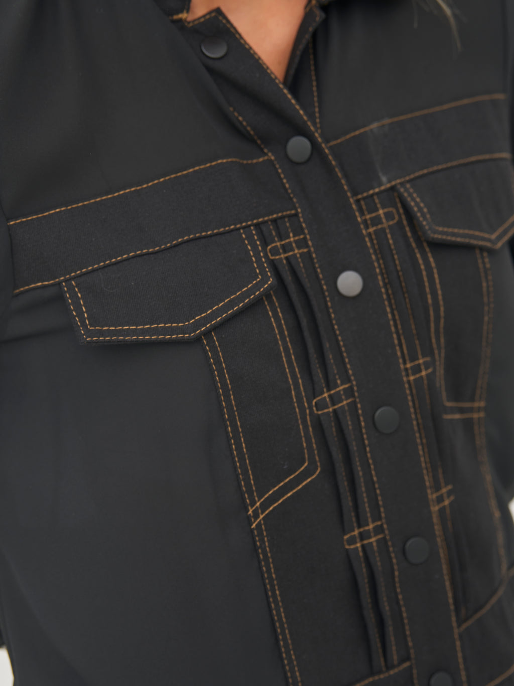 This dress combines classic denim details with modern design. It features a shirt collar, button closure all the way down, and contrasting stitching that accentuates the structural lines. Pockets both front and back add functionality, while the transparent lower part adds a light and feminine touch.