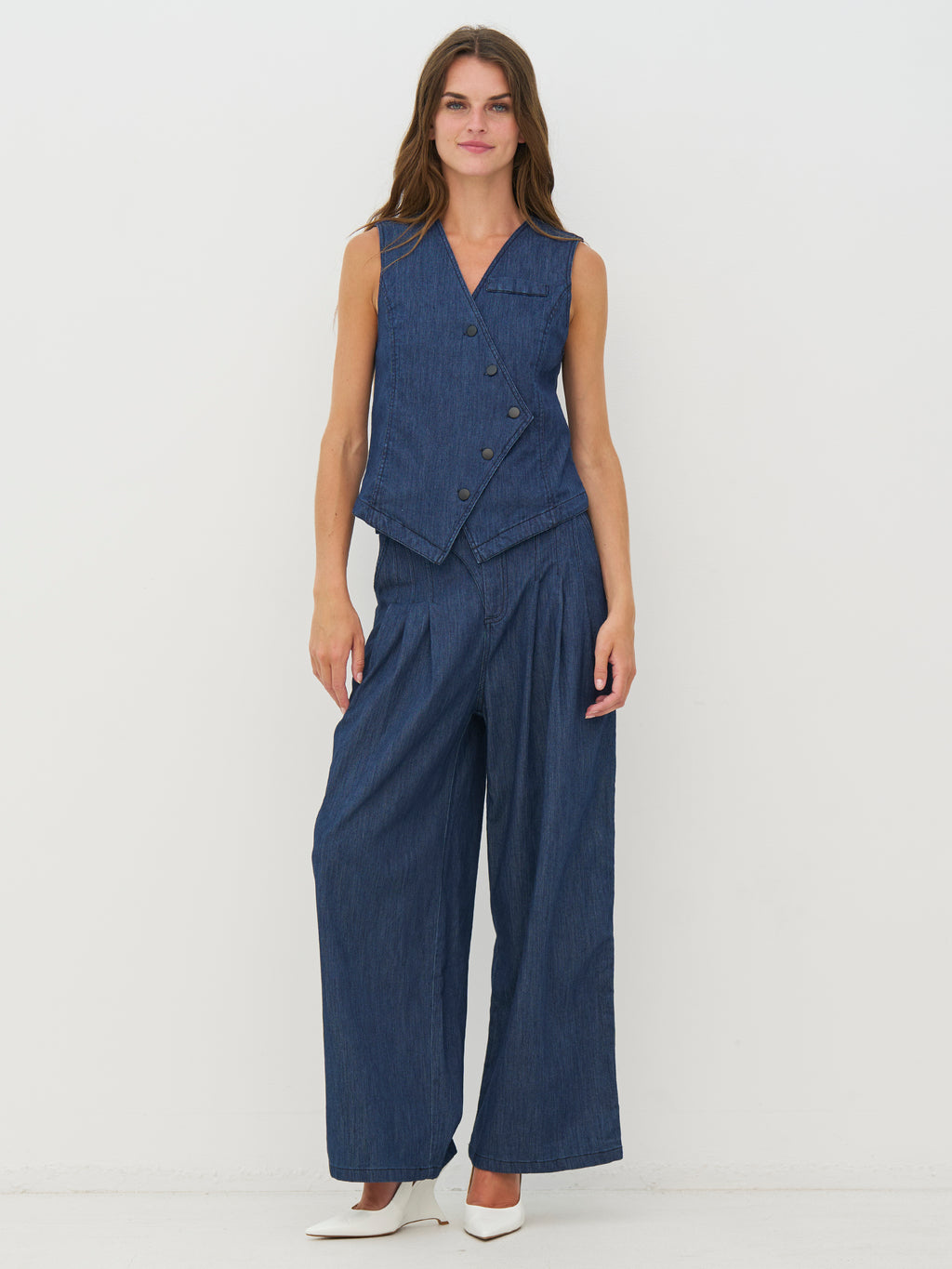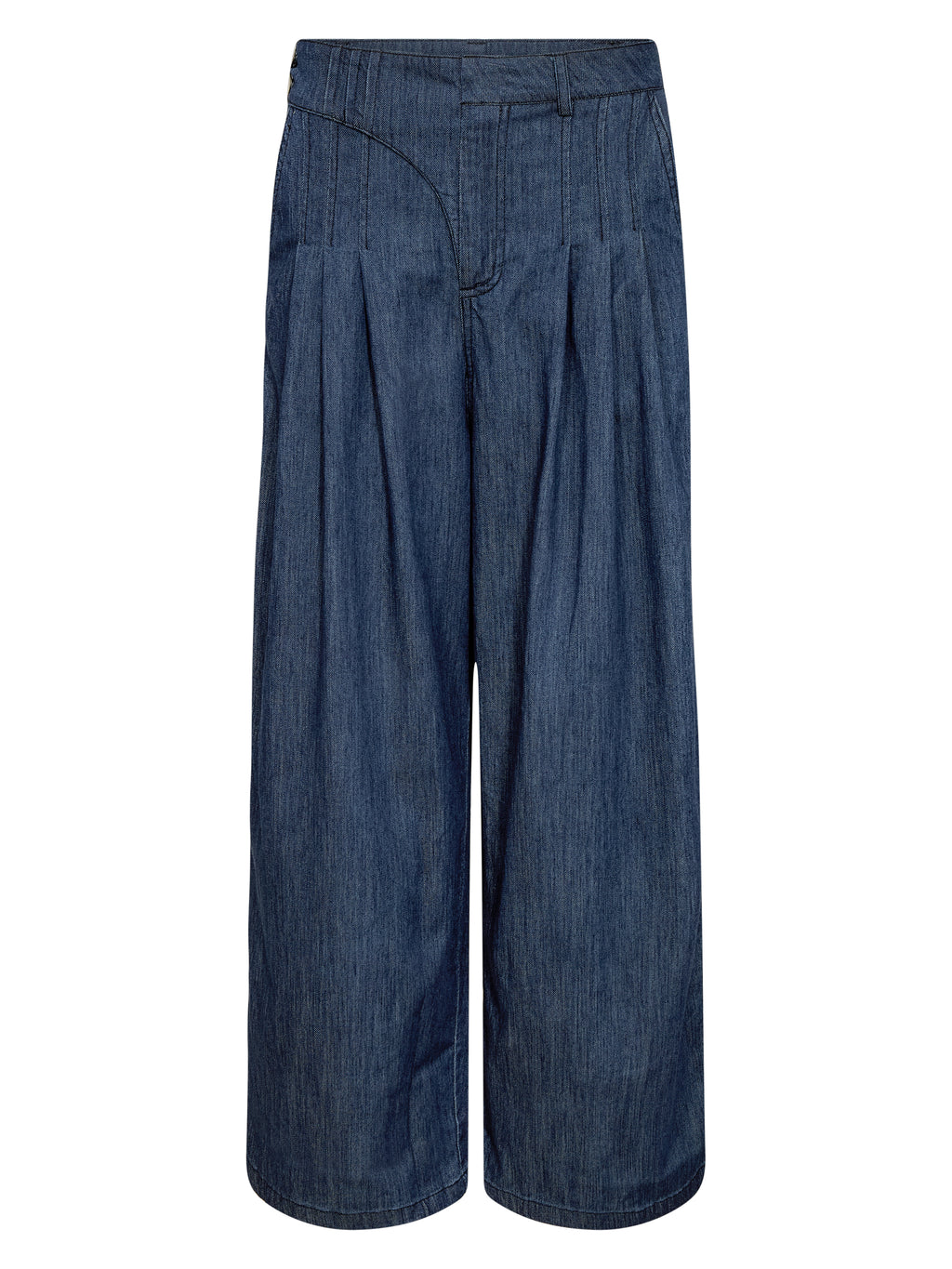These wide-leg denim trousers have an elegant and relaxed look with wide legs that fall nicely from the waist. At the front, they are designed with pleats for extra width and a nice drape, while keeping the lines clean and simple. The back is more classic in cut, creating balance in the design. Style the trousers with a simple top or the matching top for a complete everyday look.