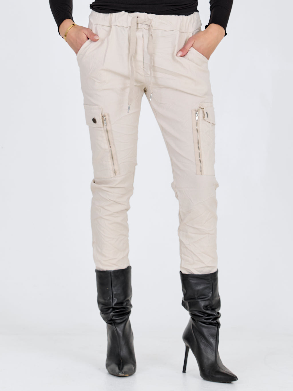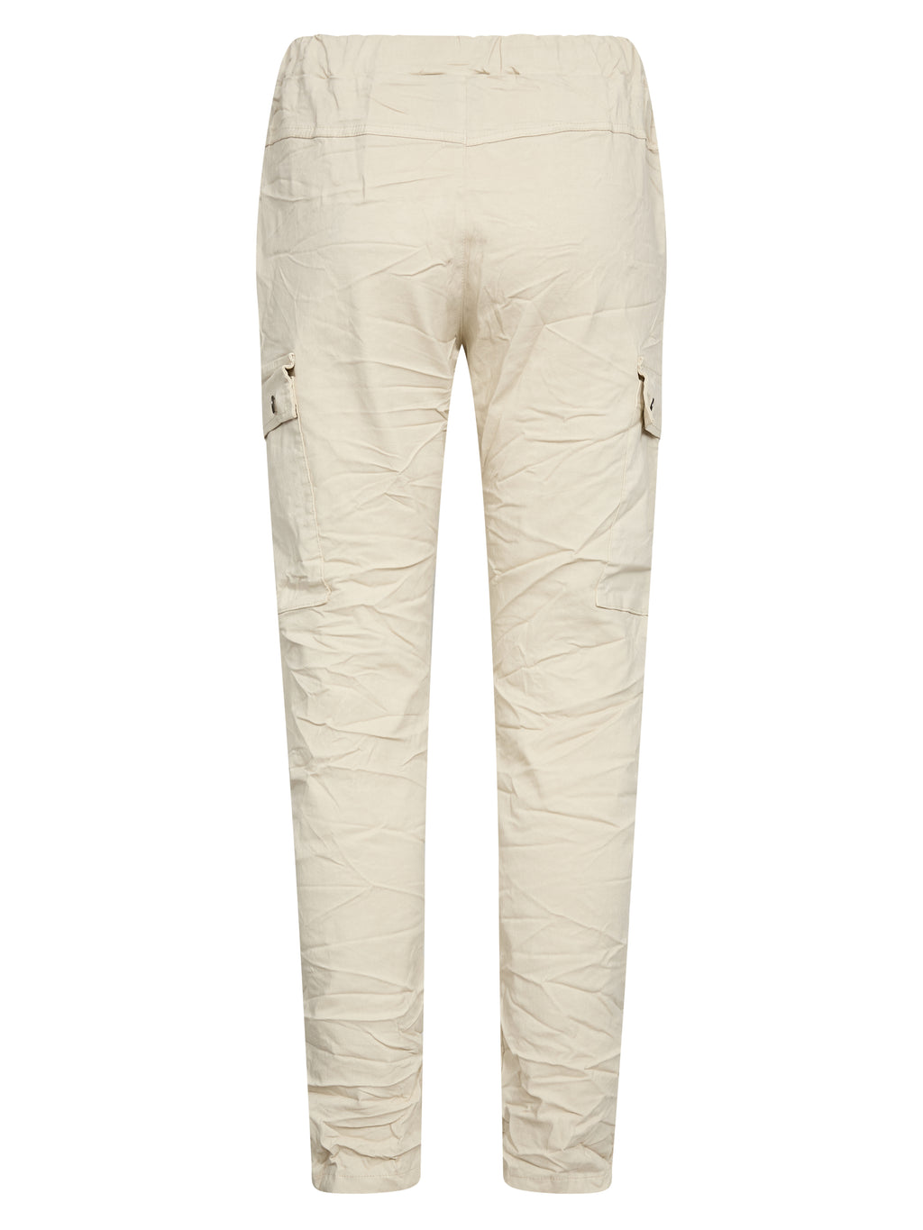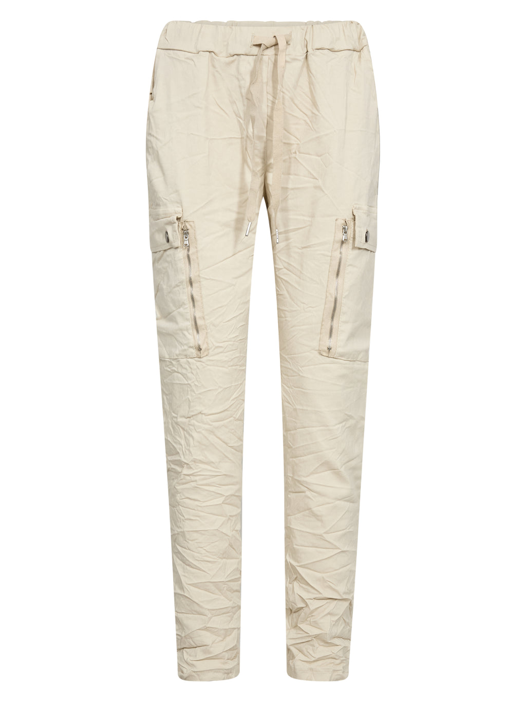 These cool trousers are in a delightful cotton quality with plenty of stretch. The trousers have a slight baggy fit and an elastic waist with a tie belt, ensuring fantastic comfort. In the middle of the trousers, there are two large buttoned pockets and a long decorative zip, adding a raw detail.