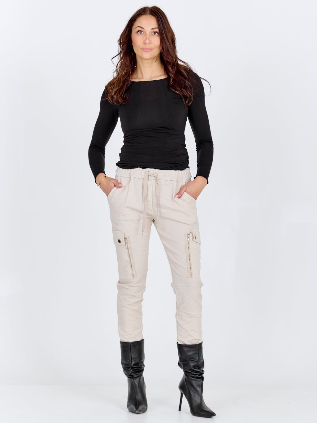 Our popular Carmen fit is known for its cargo design and comfortable comfort. The trousers in the Carmen fit are in an extremely stretchy material, fitting nicely in the legs, with a regular, elastic waist with a tie belt. Choose your usual size. If you want a more fitted fit, you can go down a size, or up a size for a more baggy fit.