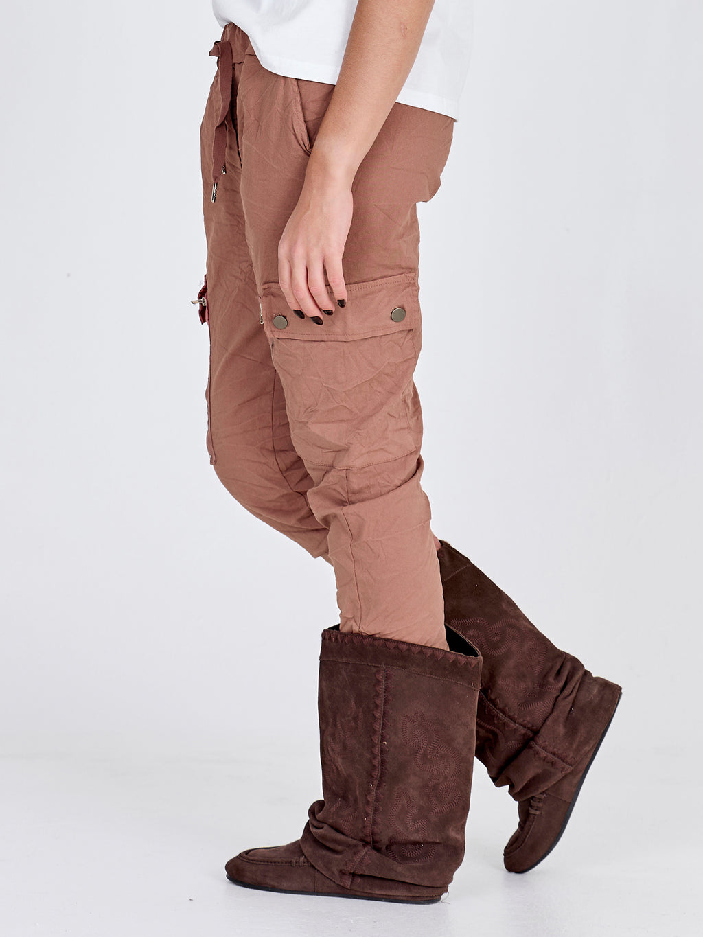 - Elastic waist with a tie belt.