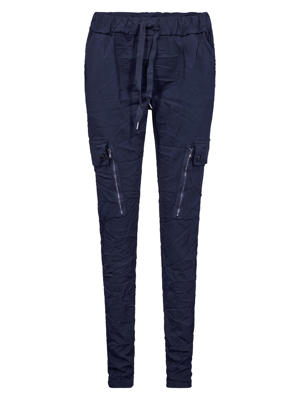 These cool trousers are in a delightful cotton quality with plenty of stretch. The trousers have a slight baggy fit and an elastic waist with a tie belt, ensuring fantastic comfort. In the middle of the trousers, there are two large buttoned pockets and a long decorative zip, adding a raw detail.