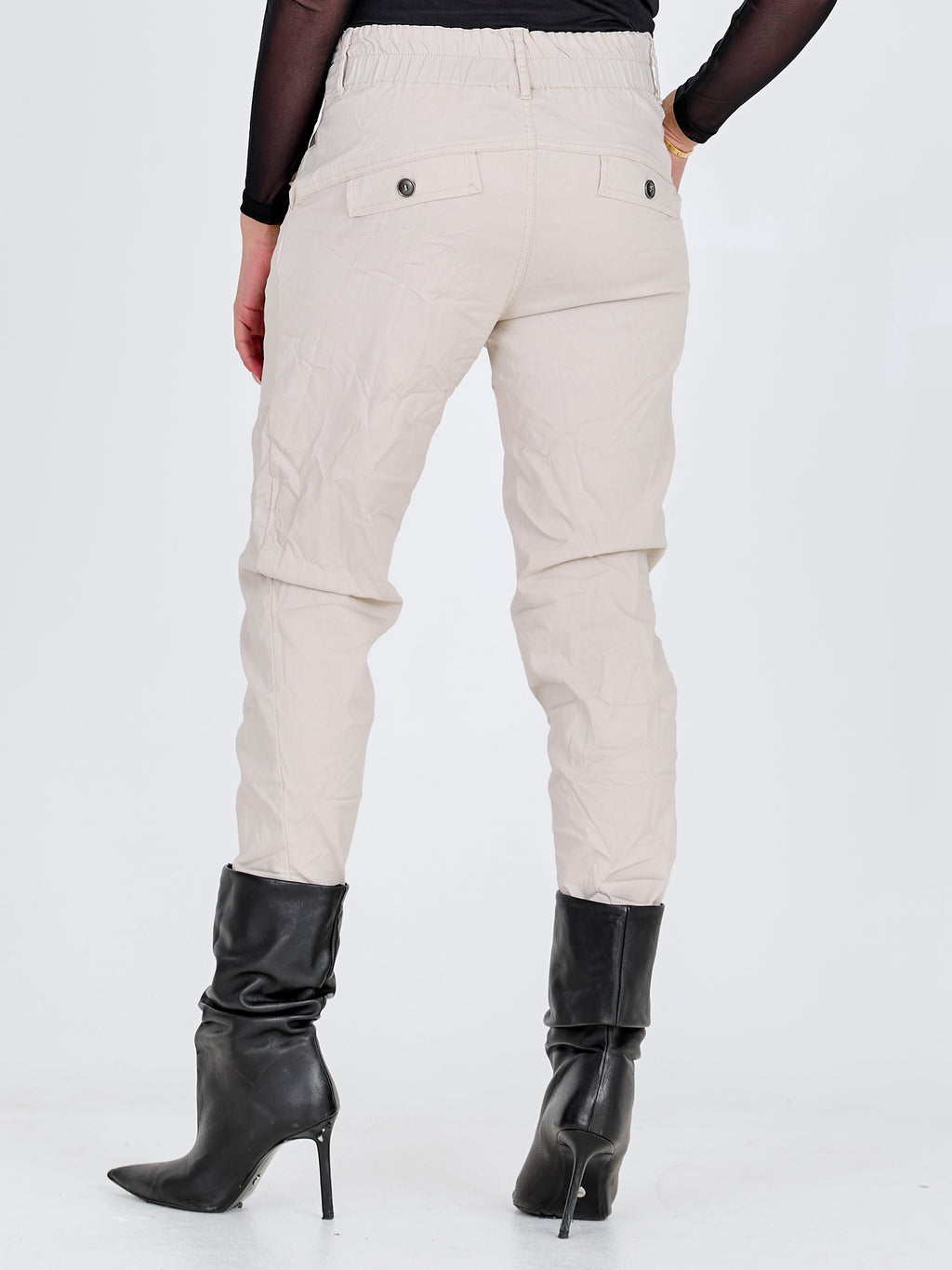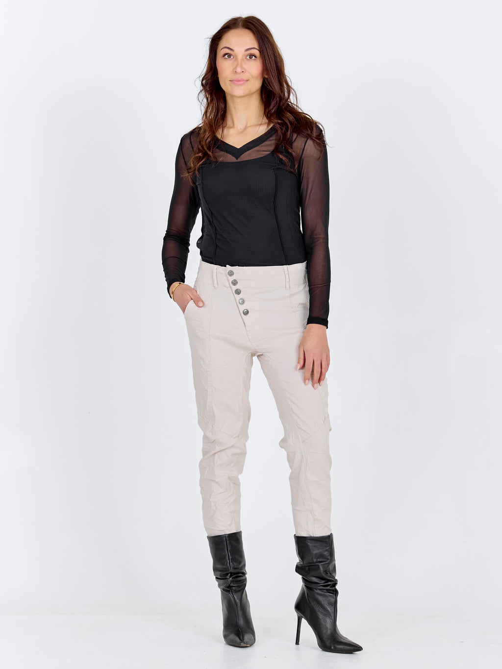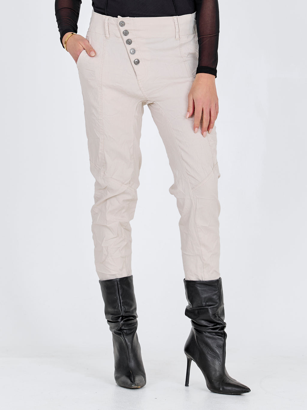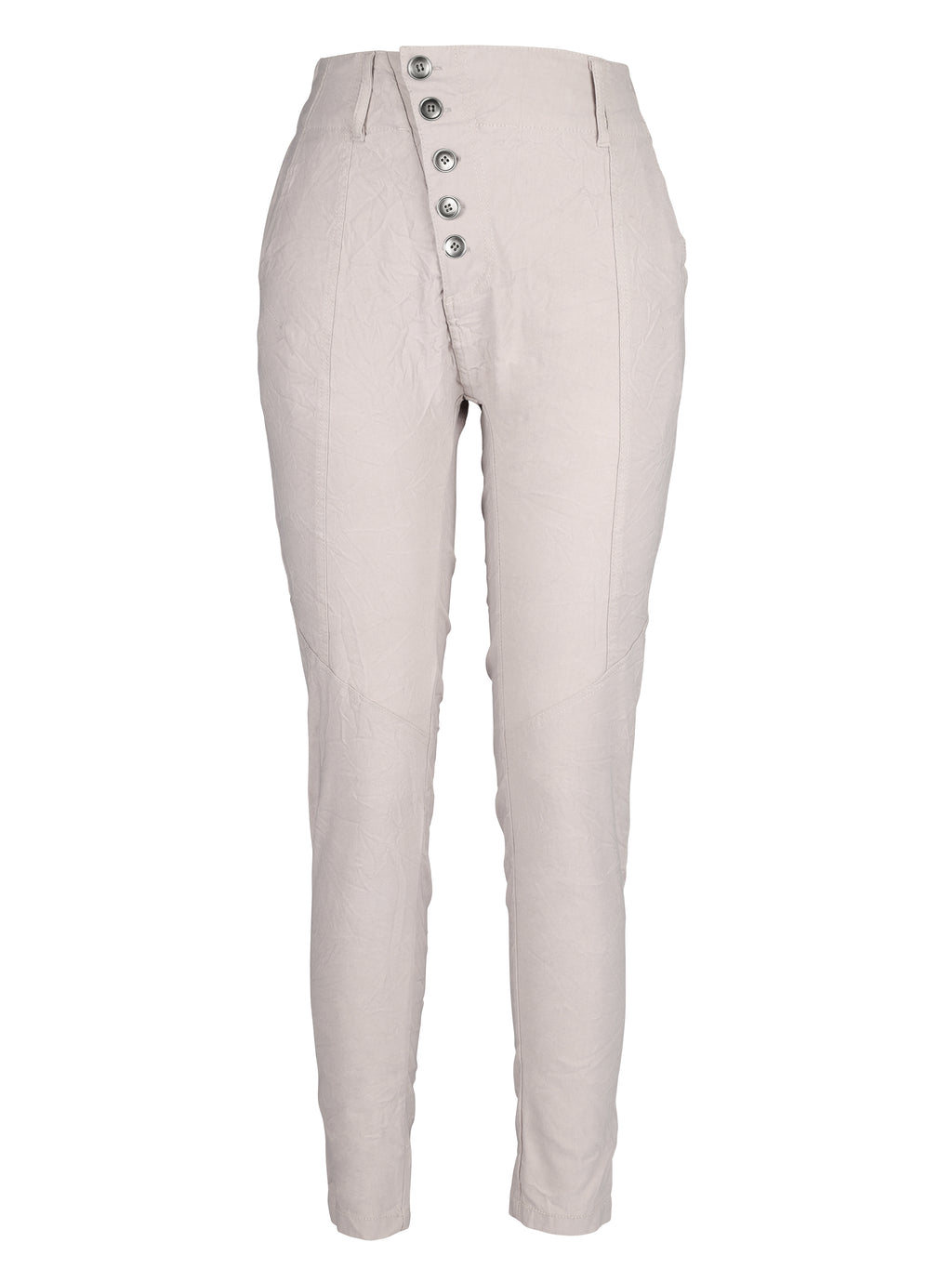 These trousers are perfect for both formal and casual occasions. For a sophisticated everyday look, try combining them with a shirt and some simple jewelry. The trousers' side pockets give them a practical touch, while the unique front button closure adds a modern twist.