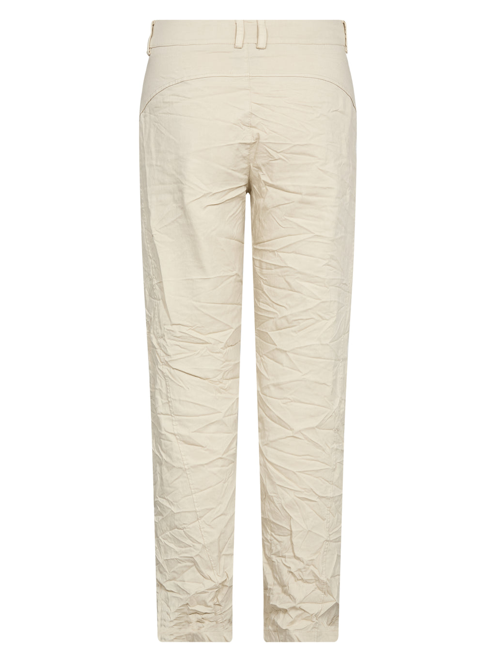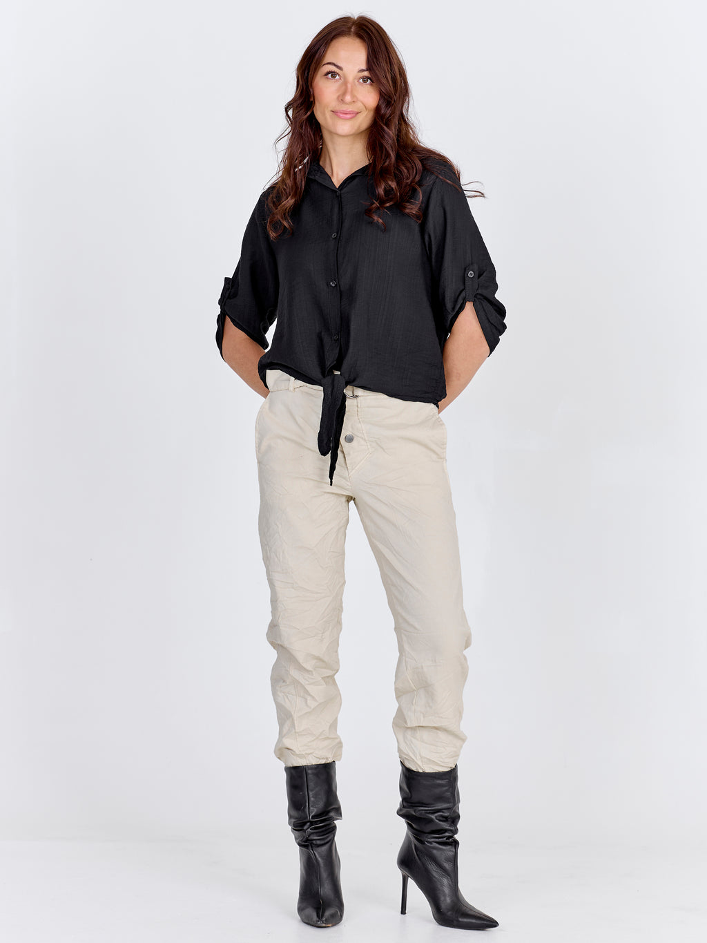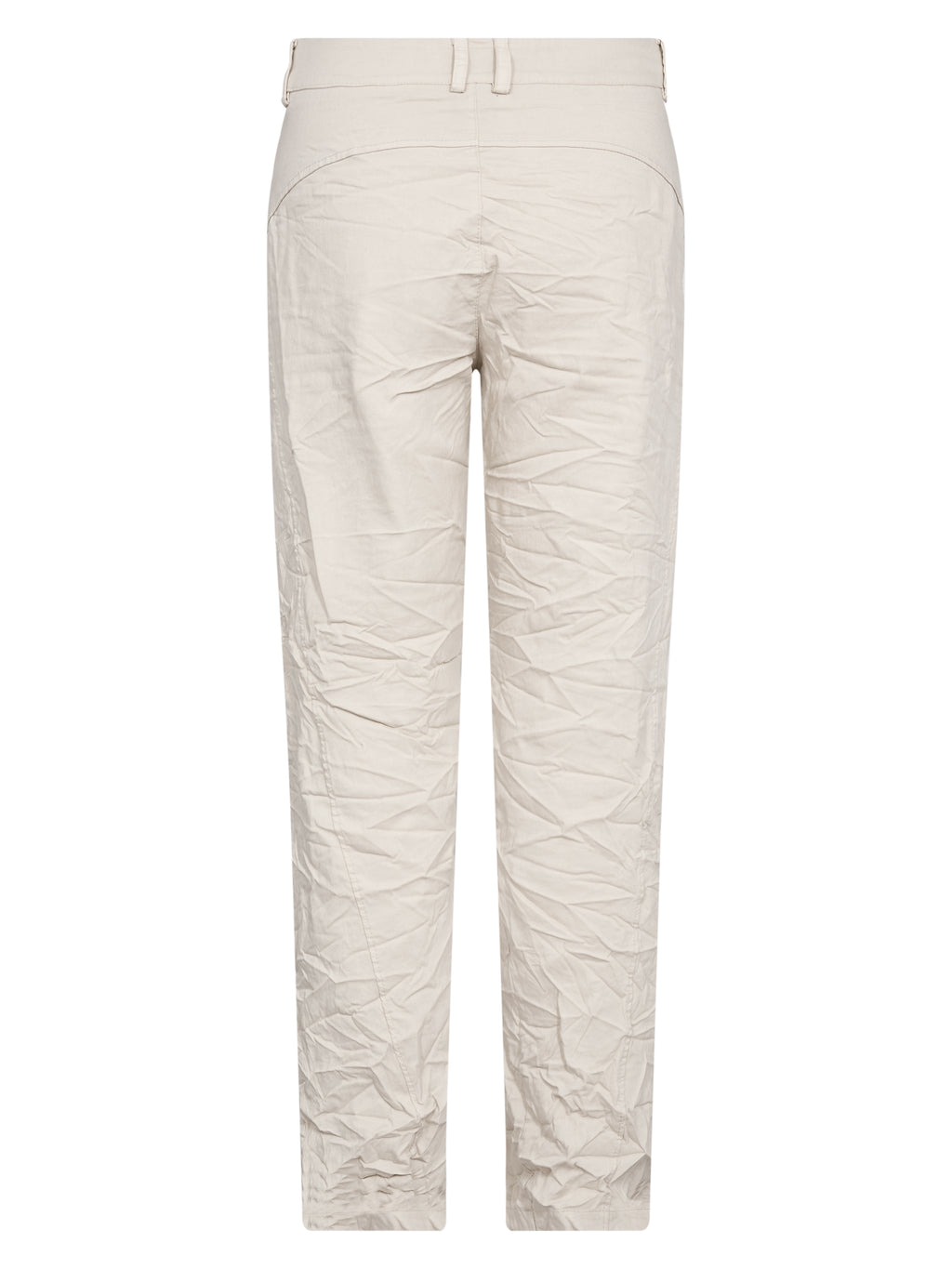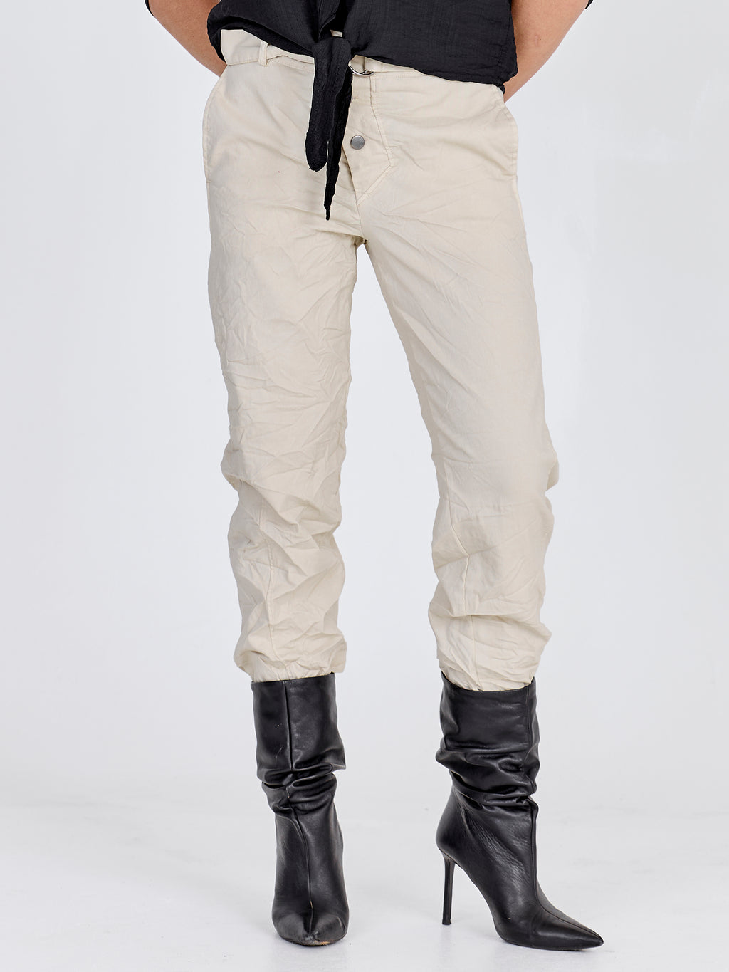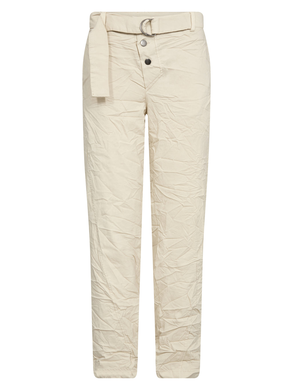 These pants are designed with a slim leg and a distinctive waistband, giving a simple and timeless look. At the front, they have a diagonal button closure and a belt with a metal ring, adding a clean and stylish detail play. At the back, the cut is clean with belt loops and markings that emphasize the fit. Style them with a lightweight knit or a shirt for a relaxed yet polished everyday look.