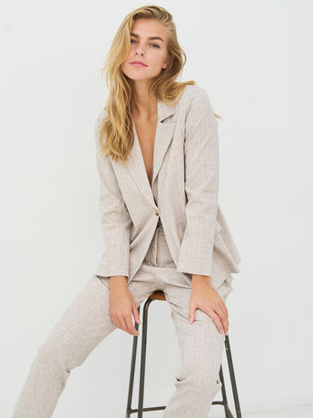 These pants are designed with a slim leg and a distinctive waistband, giving a simple and timeless look. At the front, they have a diagonal button closure and a belt with a metal ring, adding a clean and stylish detail play. At the back, the cut is clean with belt loops and markings that emphasize the fit. Style them with a lightweight knit or a shirt for a relaxed yet polished everyday look.