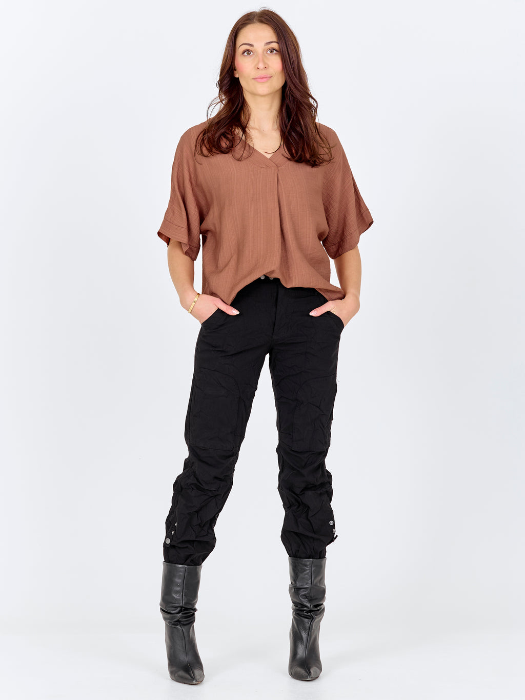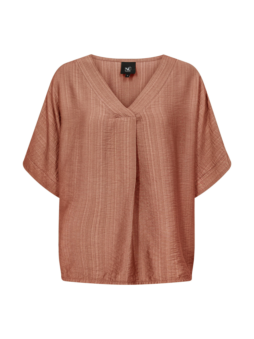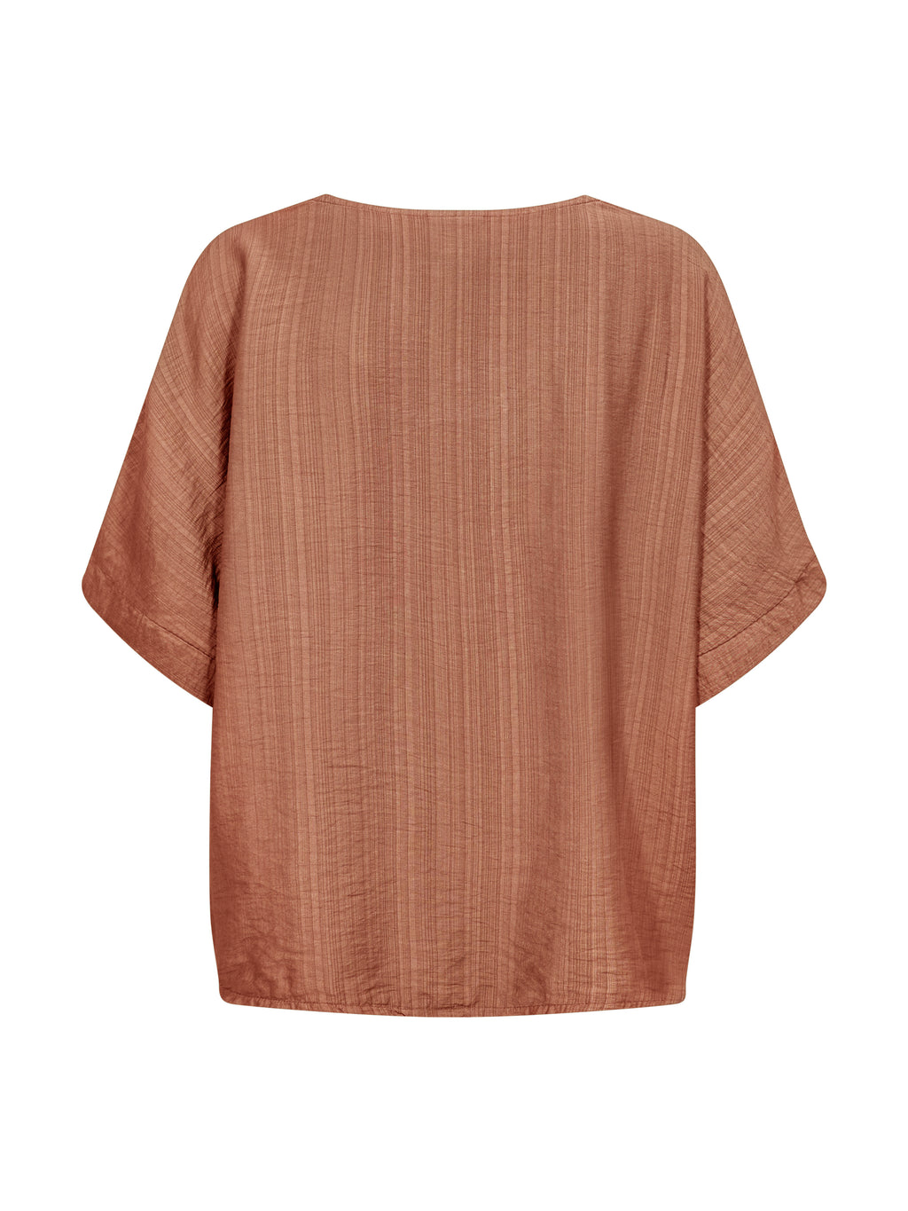This airy blouse combines comfort and simplicity with its lightly structured material and relaxed fit. It features short, loose-fitting sleeves and a V-neckline with a decorative fold in the front, adding a soft focal point to the design. The wide sleeve edge gives the blouse a subtle lift and rounds off the relaxed look.