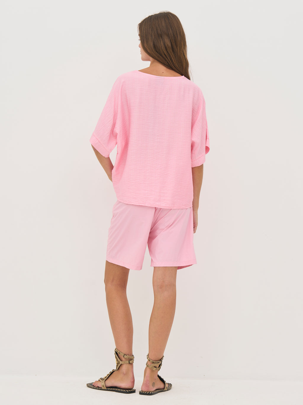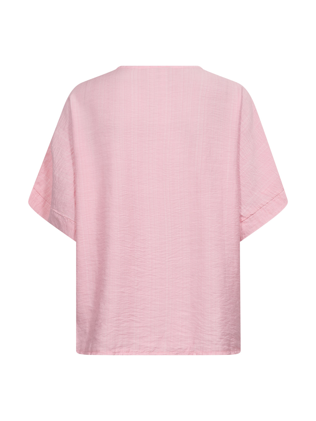 This airy blouse combines comfort and simplicity with its lightly structured material and relaxed fit. It features short, loose-fitting sleeves and a V-neckline with a decorative fold in the front, adding a soft focal point to the design. The wide sleeve edge gives the blouse a subtle lift and rounds off the relaxed look.