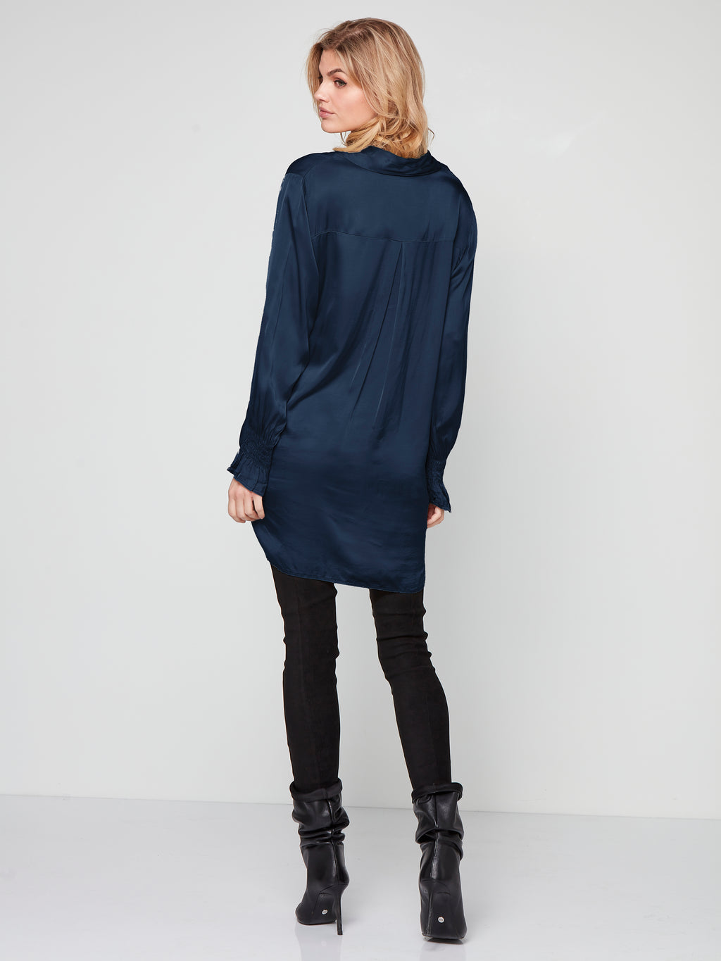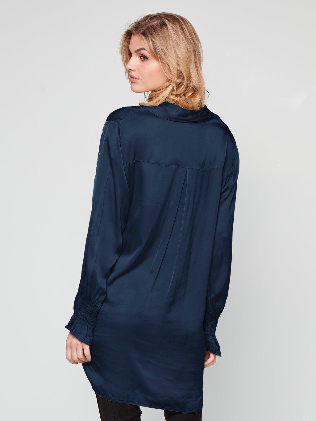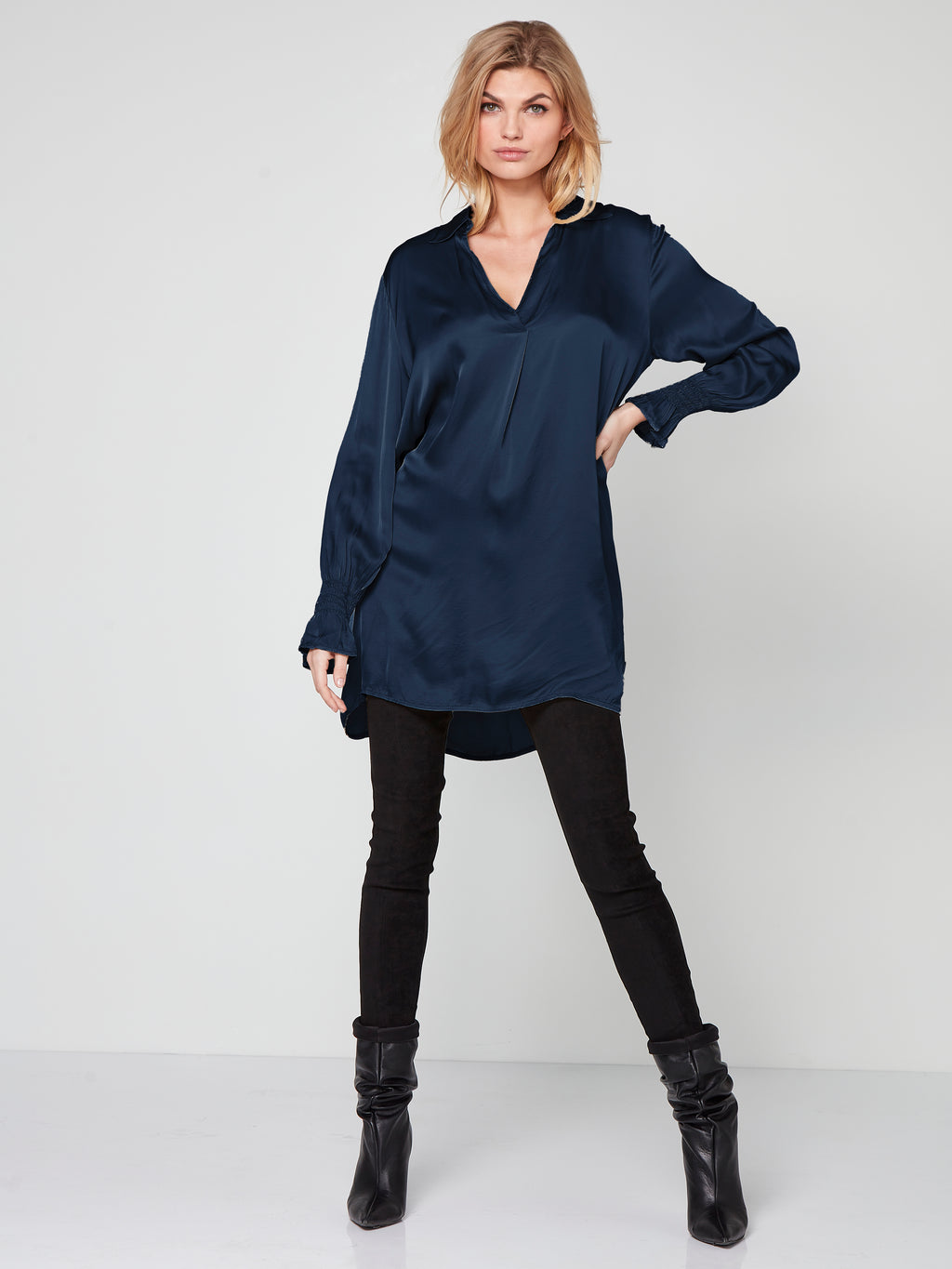 This tunic is the perfect combination of comfort and style. Made from a lustrous viscose, it is a luxurious style for any outfit. Designed in a loose-fitting silhouette, the tunic features a feminine V-neckline with a classic shirt collar and long sleeves with a delicate smock detail. Add a touch of glamour to your outfit with this tunic - wear it with a pair of your everyday trousers or leggings.