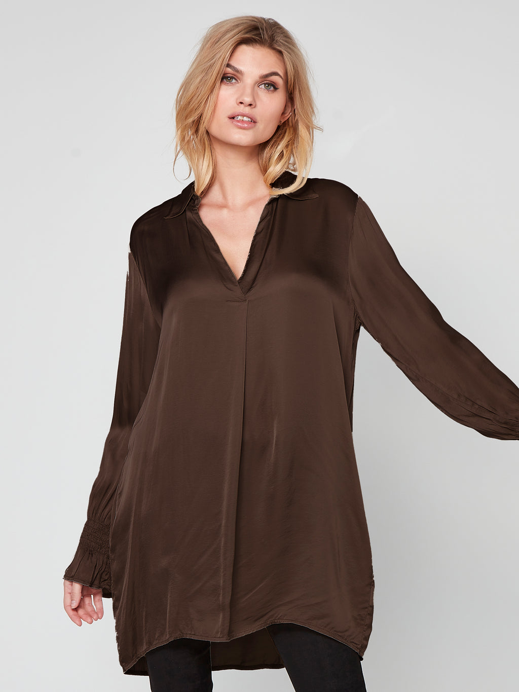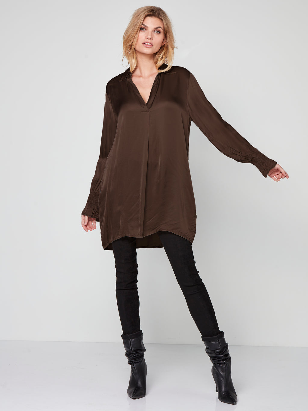 This tunic is the perfect combination of comfort and style. Made from a lustrous viscose, it is a luxurious style for any outfit. Designed in a loose-fitting silhouette, the tunic features a feminine V-neckline with a classic shirt collar and long sleeves with a delicate smock detail. Add a touch of glamour to your outfit with this tunic - wear it with a pair of your everyday trousers or leggings.