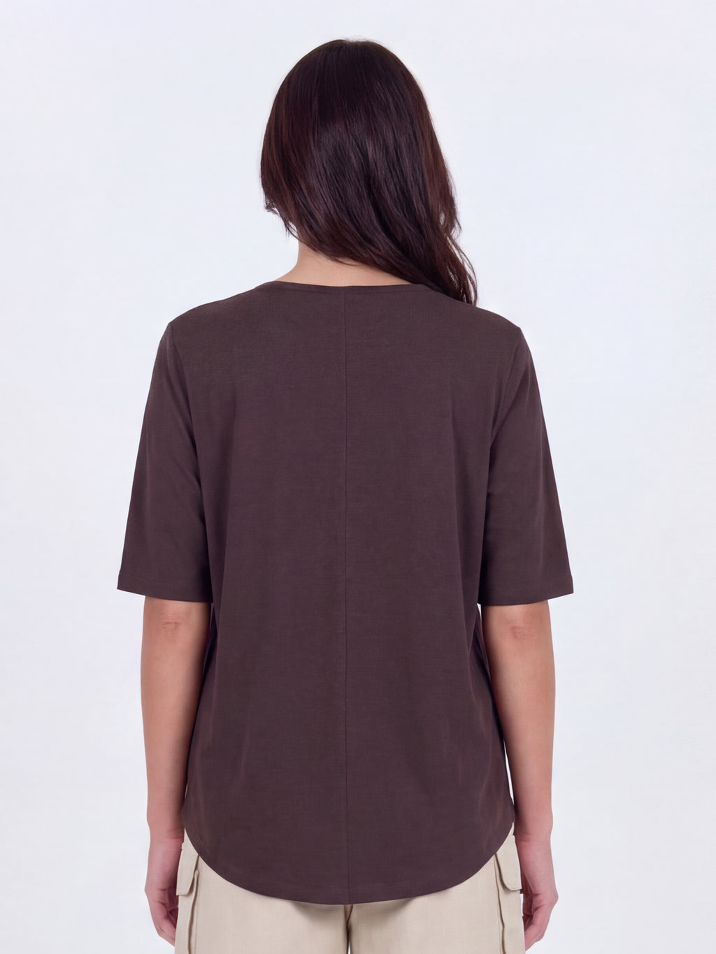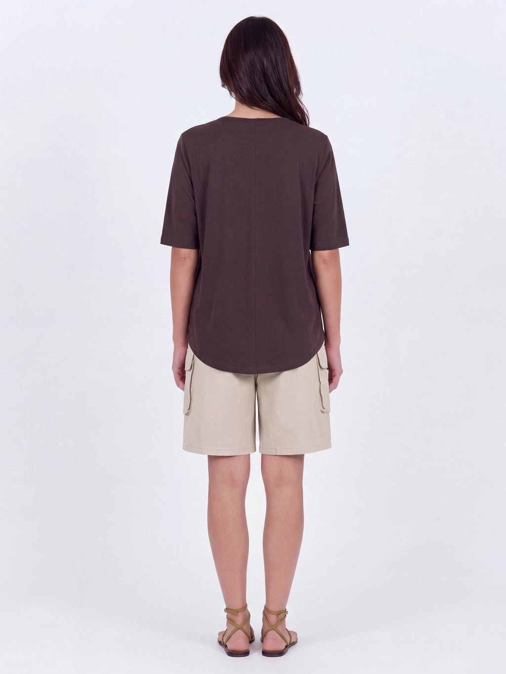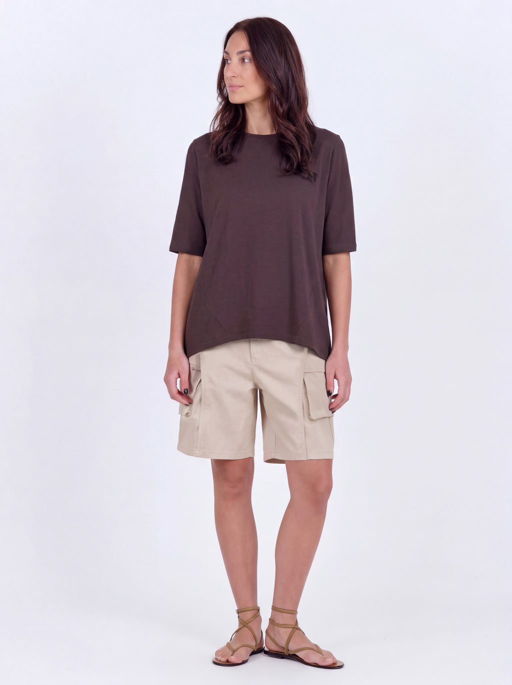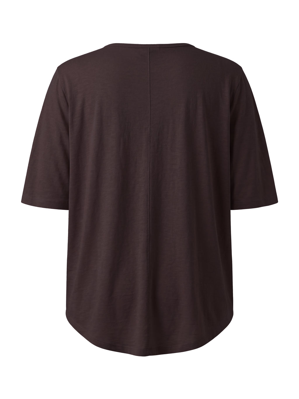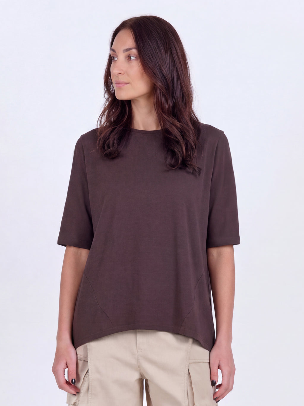 A lovely t-shirt made from a soft and comfortable cotton fabric. The t-shirt is designed with an oversized fit and is slightly longer at the back than at the front, which gives a comfortable feel perfect for warm days. In addition, the sleeves of the T-shirt can be opened to create two different looks. Style this T-shirt with a pair of cargo pants for a cool and casual everyday outfit.