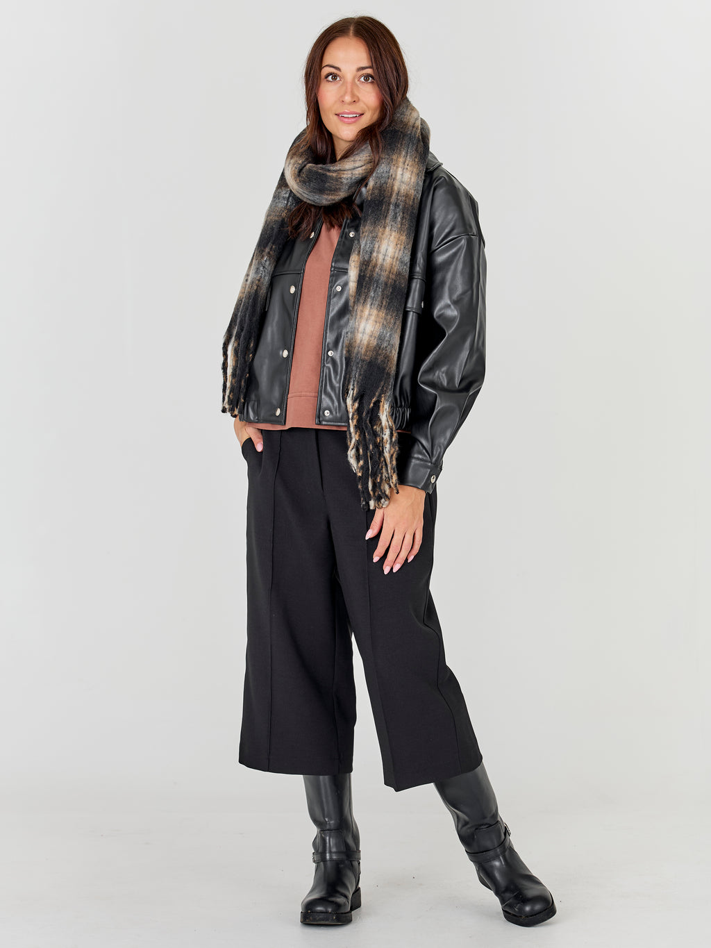This leather-look jacket combines modern design with practical details, making it a versatile and stylish choice. It features an elastic hem band at the bottom, creating a flattering silhouette, and front snap buttons for easy closure. Two decorative pockets located just below the chest provide a discreet yet functional element, contributing to the exclusive design.