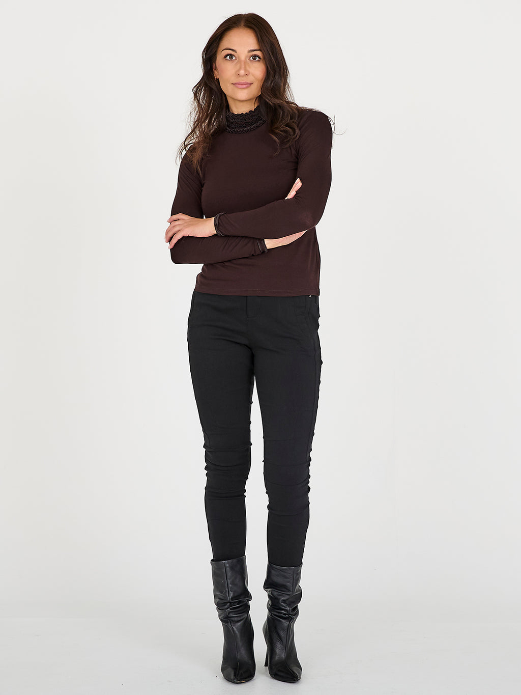 This long-sleeved t-shirt has a simple and feminine expression with a close-fitting cut and fine details. The high neck is adorned with decorative ruffles, creating a slightly romantic look. The material is soft and stretchy, providing both comfort and a smooth silhouette. The sleeve cuffs have a subtle wavy edge, completing the delicate design.