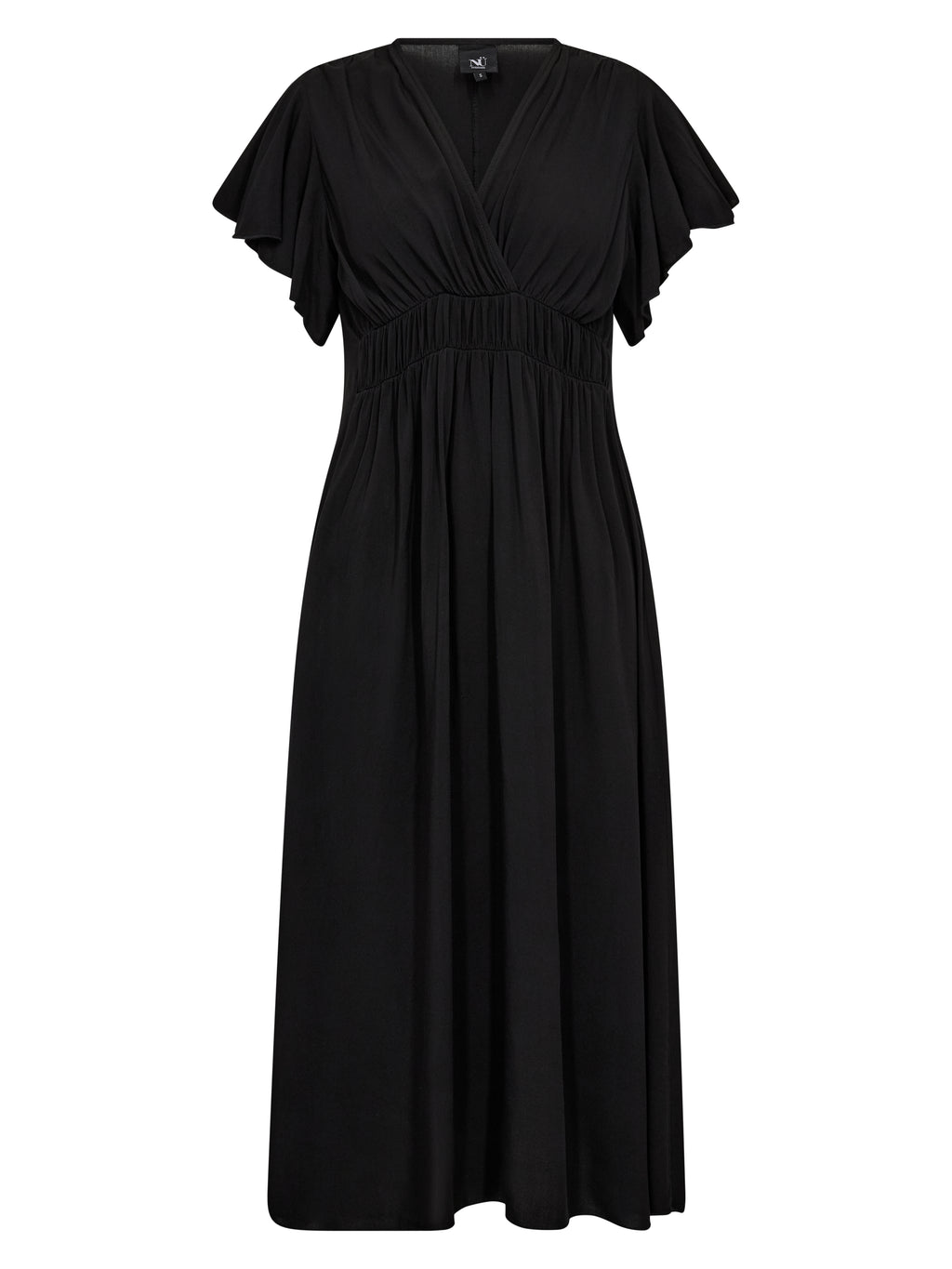 The dress has a soft and feminine cut with a v-neck and a small delicate sleeve. A narrow elastic band at the front creates a flattering silhouette and provides a natural flow. The back is simple and smooth, emphasizing the dress's clean look. The lightweight materials and loose fit make it comfortable to wear all day.