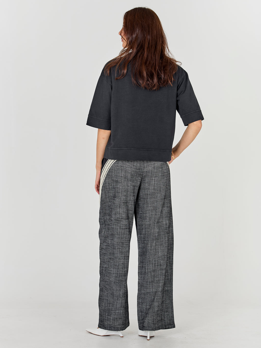 This boxy t-shirt is made from a soft sweat material with a light structure that gives a relaxed yet stylish look. It has a loose fit, dropped shoulders, and wide sleeves - perfect for both casual days and cool everyday looks.
