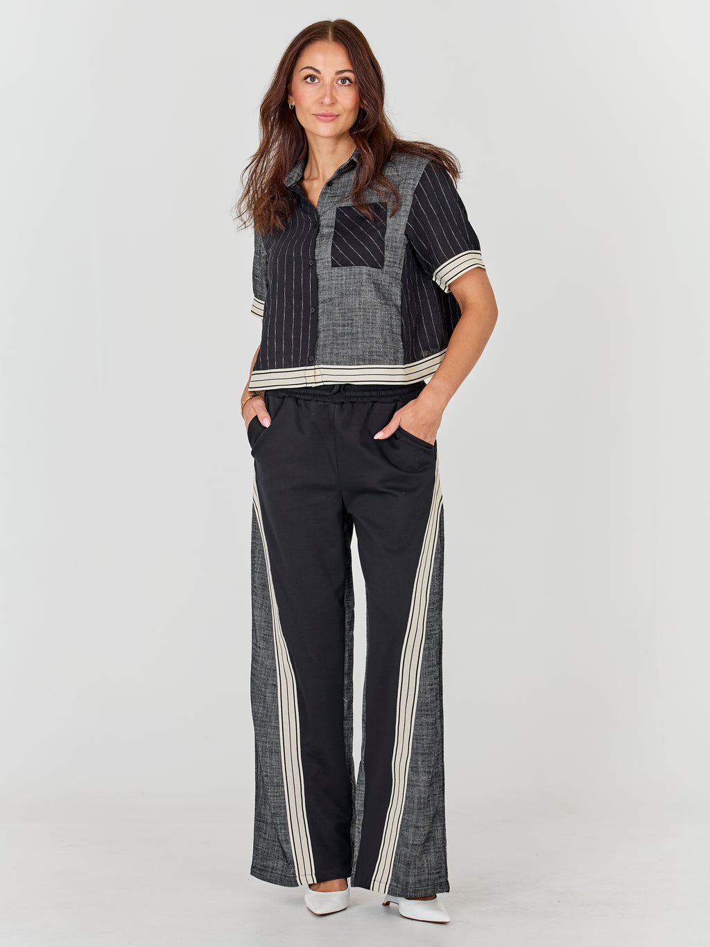 Wear the shirt open over a top and match it with the corresponding pants for a relaxed and stylish everyday outfit.