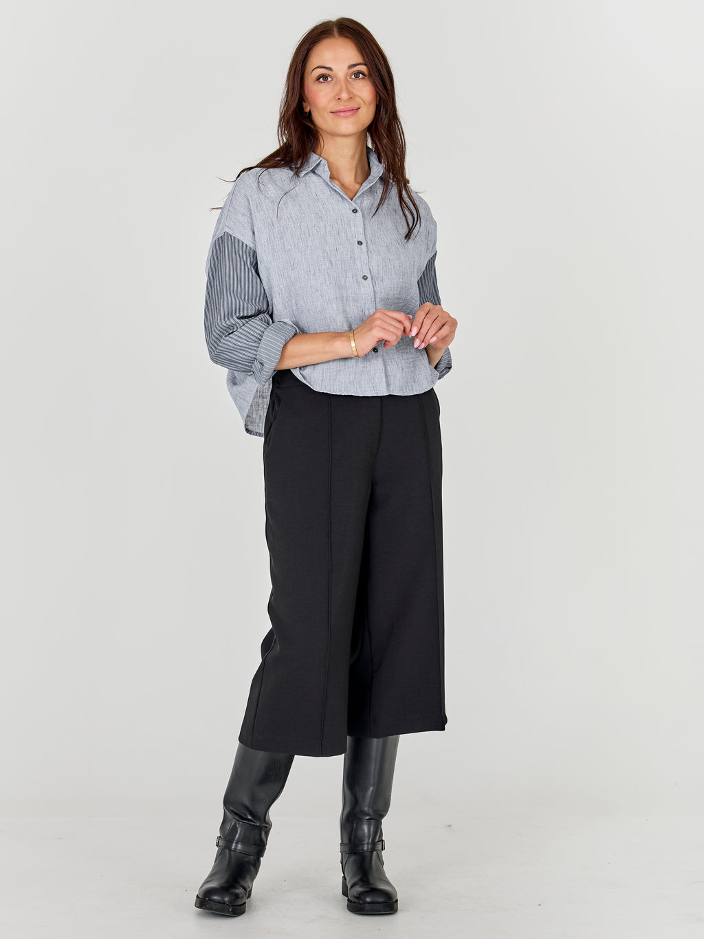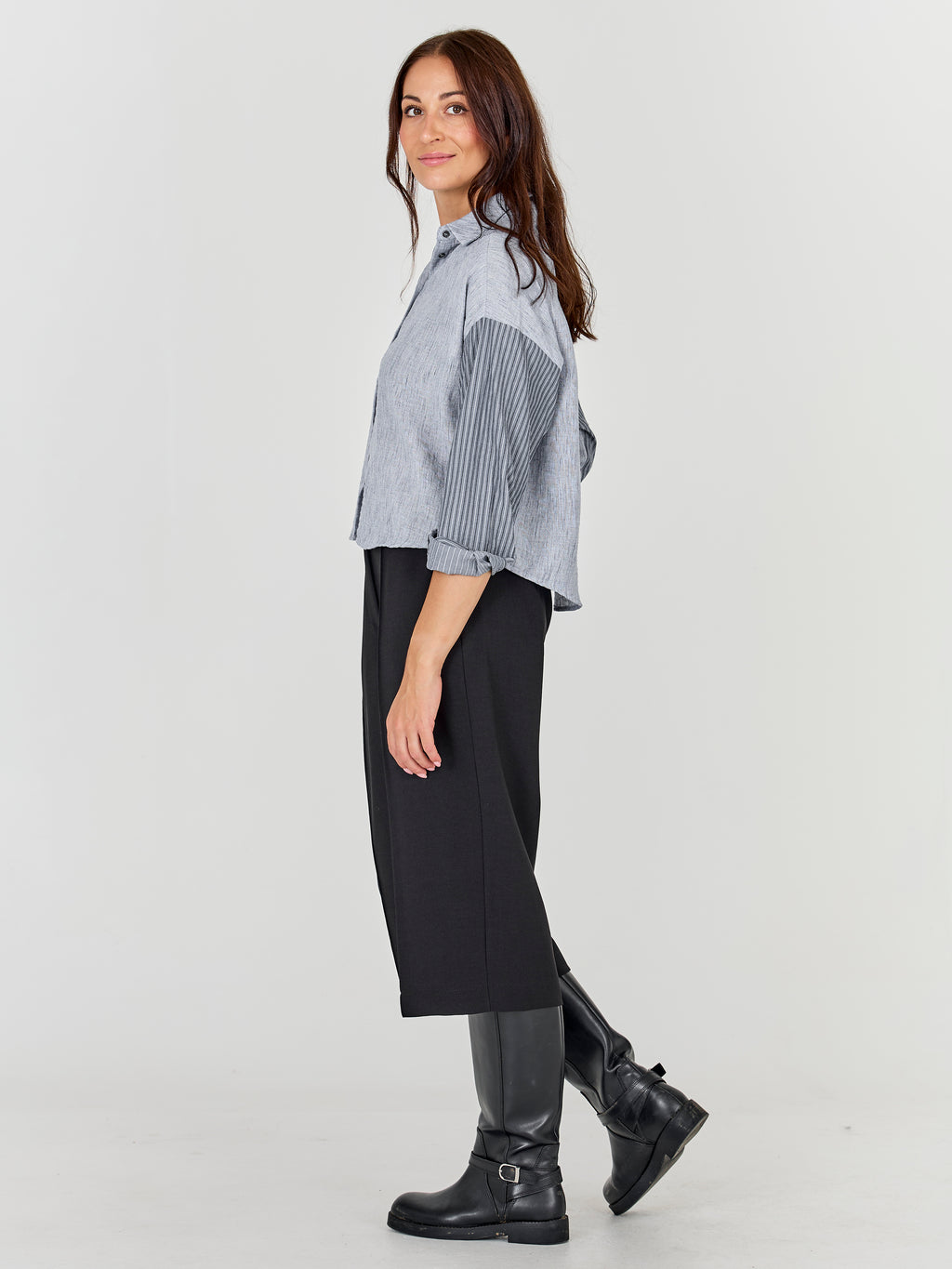 This shirt has a simple expression with nice contrasts, creating a modern twist. It has a uniform, mottled structure, while the sleeves have vertical stripes and wide cuffs with button closure. The shirt closes with buttons all the way down, and the back follows the same simple design as the front.