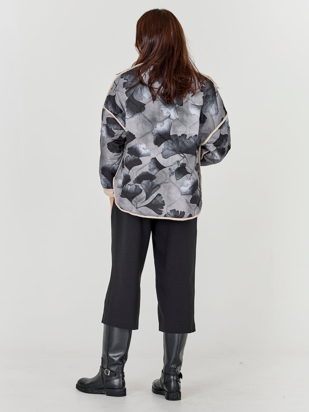 This jacket gives you two looks in one - with its reversible design, you can choose between a striking floral print or a more simple, solid side. The quilted structure provides a cozy feeling, while the round edges and snap button closure add a soft and modern look. Regardless of which side you choose, the fit is spacious and comfortable.