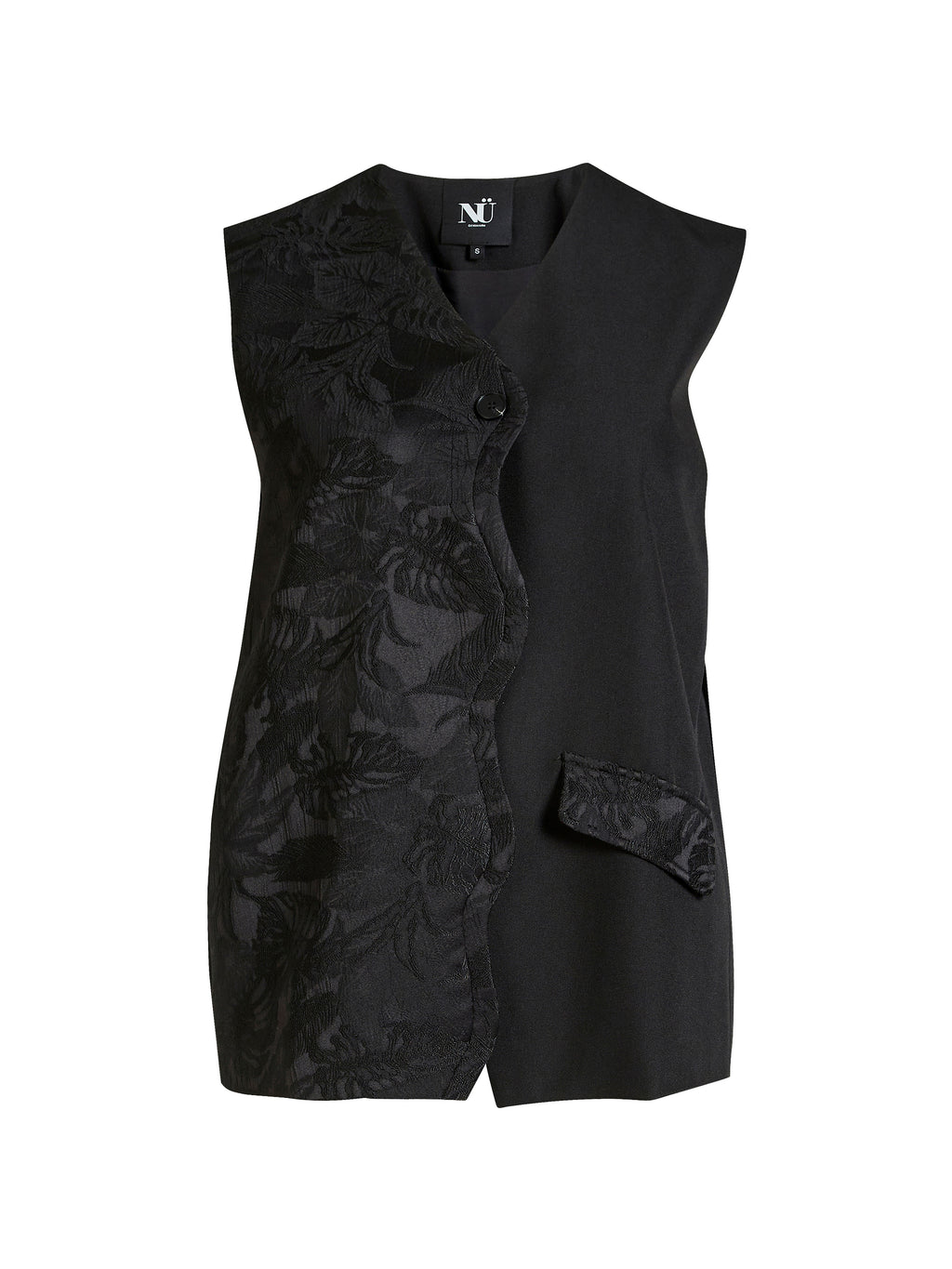 This vest combines classic tailoring with fine details. It is sleeveless and features a beautiful asymmetric front with decorative button closure. One side is adorned with textured material in a floral pattern, creating an elegant contrast. A small angled flap detail at the front completes the look.