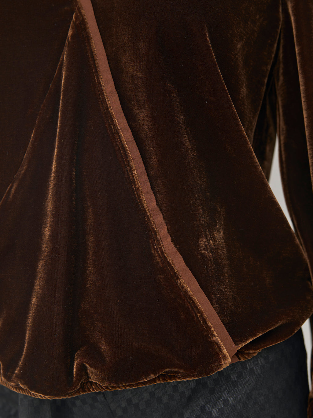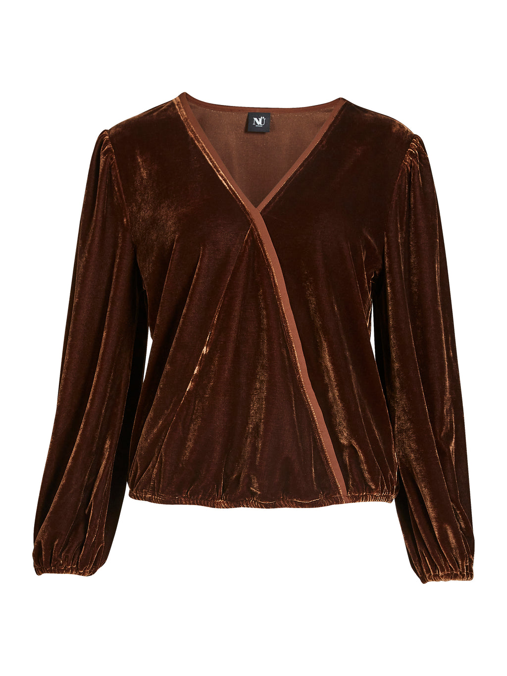 This wrap blouse combines comfort and elegance with its soft, velour-like material and flattering design. It features long sleeves with elastic at the wrists and a decorative, asymmetric wrap-effect at the front, creating a nice draping over the body. The wide elastic at the bottom ensures a good fit and a rounded expression.