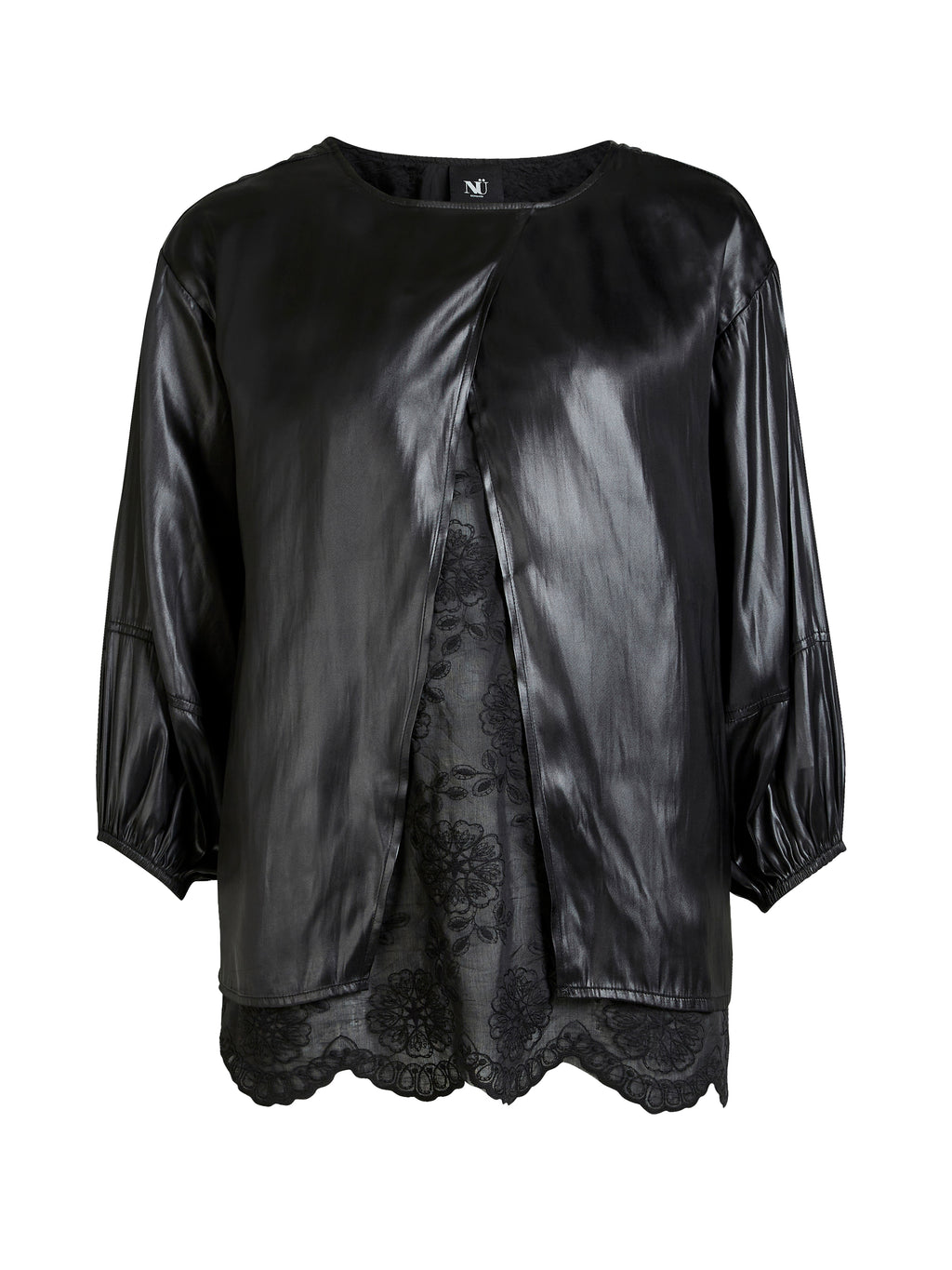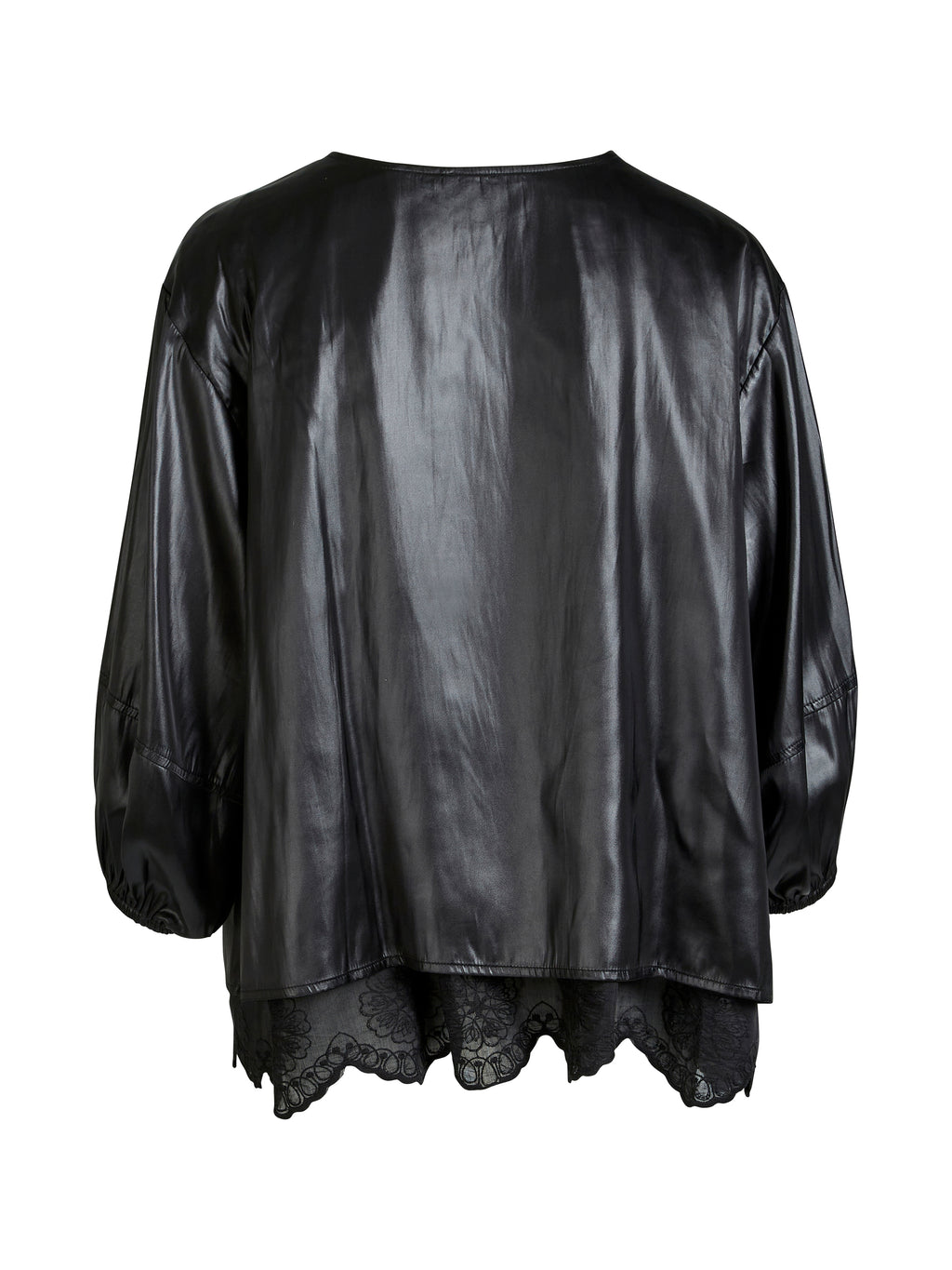 This blouse combines a cool leather look with feminine lace and thoughtful details. The top layer in faux leather has an open front with a rounded edge, elegantly revealing the soft lace insert underneath. The sleeves have a slight volume and are finished with elastic at the cuffs for a rounded silhouette.
