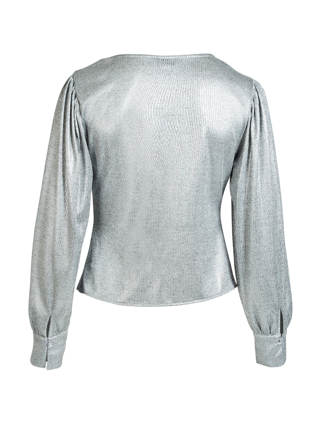Stand out with this eye-catching wrap blouse with a subtle metallic sheen. It features a flattering V-neckline and an elegant tie belt at the waist, highlighting the figure. The long sleeves are finished with cuffs for a classic look, while the fabric's shiny texture adds a modern twist.