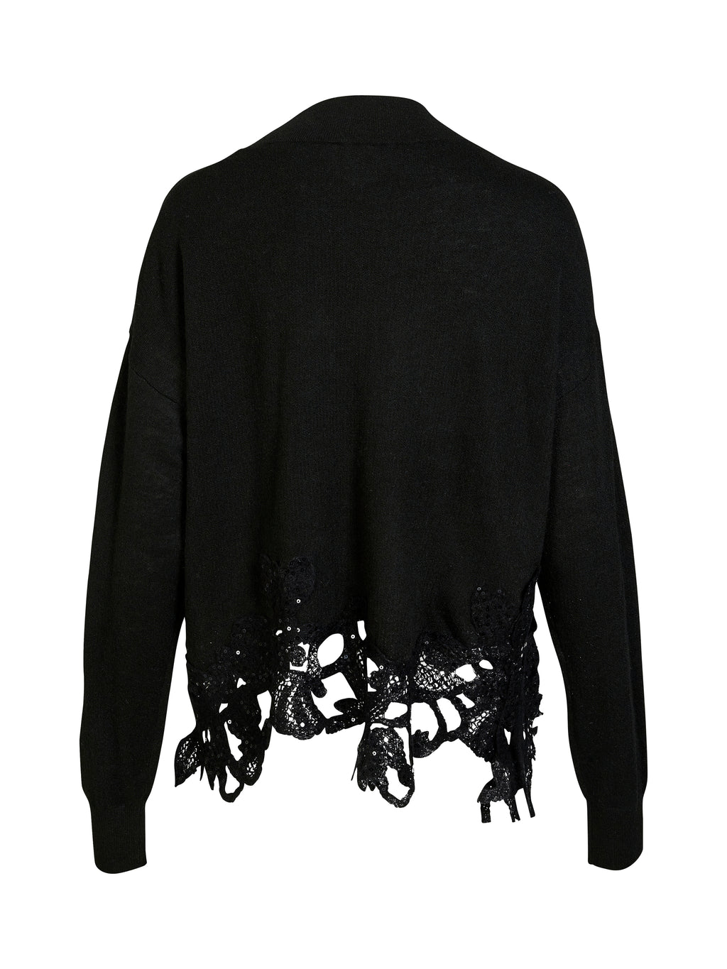 Give your outfit an exclusive touch with this knitted poncho with decorative lace edging. It has a relaxed fit and a round neckline, while the striking lace at the bottom adds a feminine and festive look. The lightly transparent lace panel is adorned with small sequins that catch the light, creating a subtle shine.