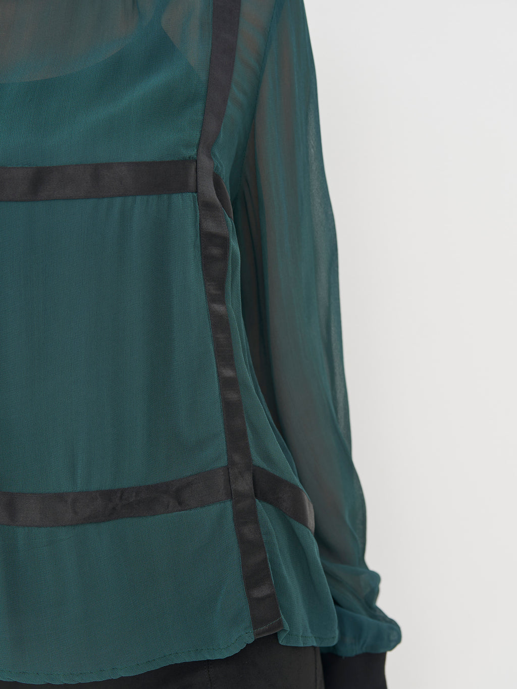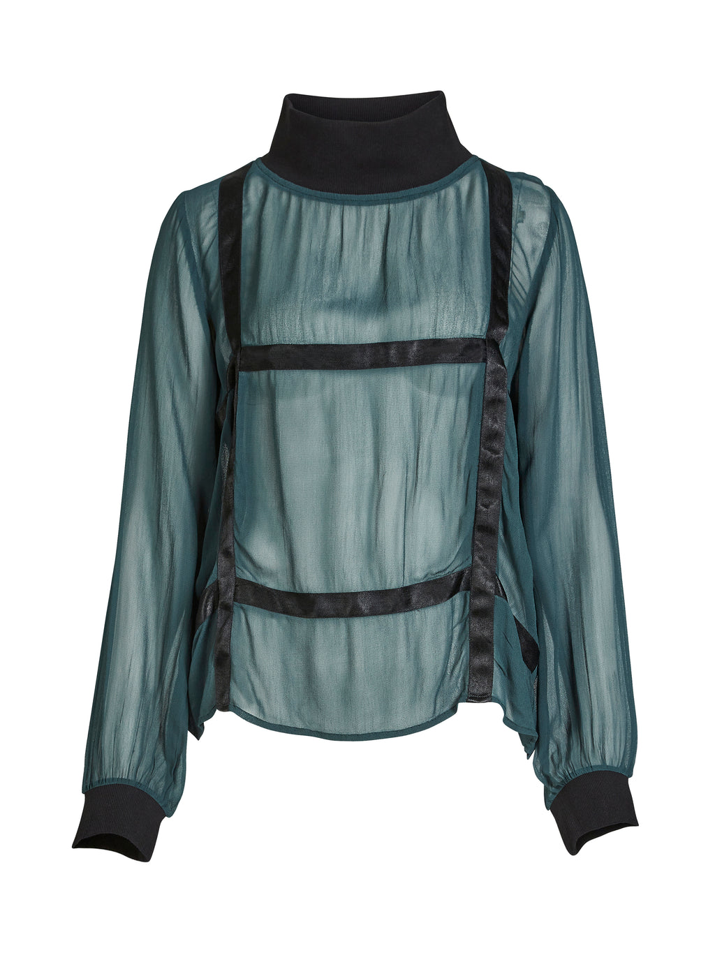 Stand out in this stylish blouse in light transparent material with prominent contrast bands. It features long sleeves with rib cuffs and a high, soft ribbed collar, providing a sporty and modern contrast to the feminine fabric. The wide bands create a graphic effect and emphasize the unique design of the blouse.