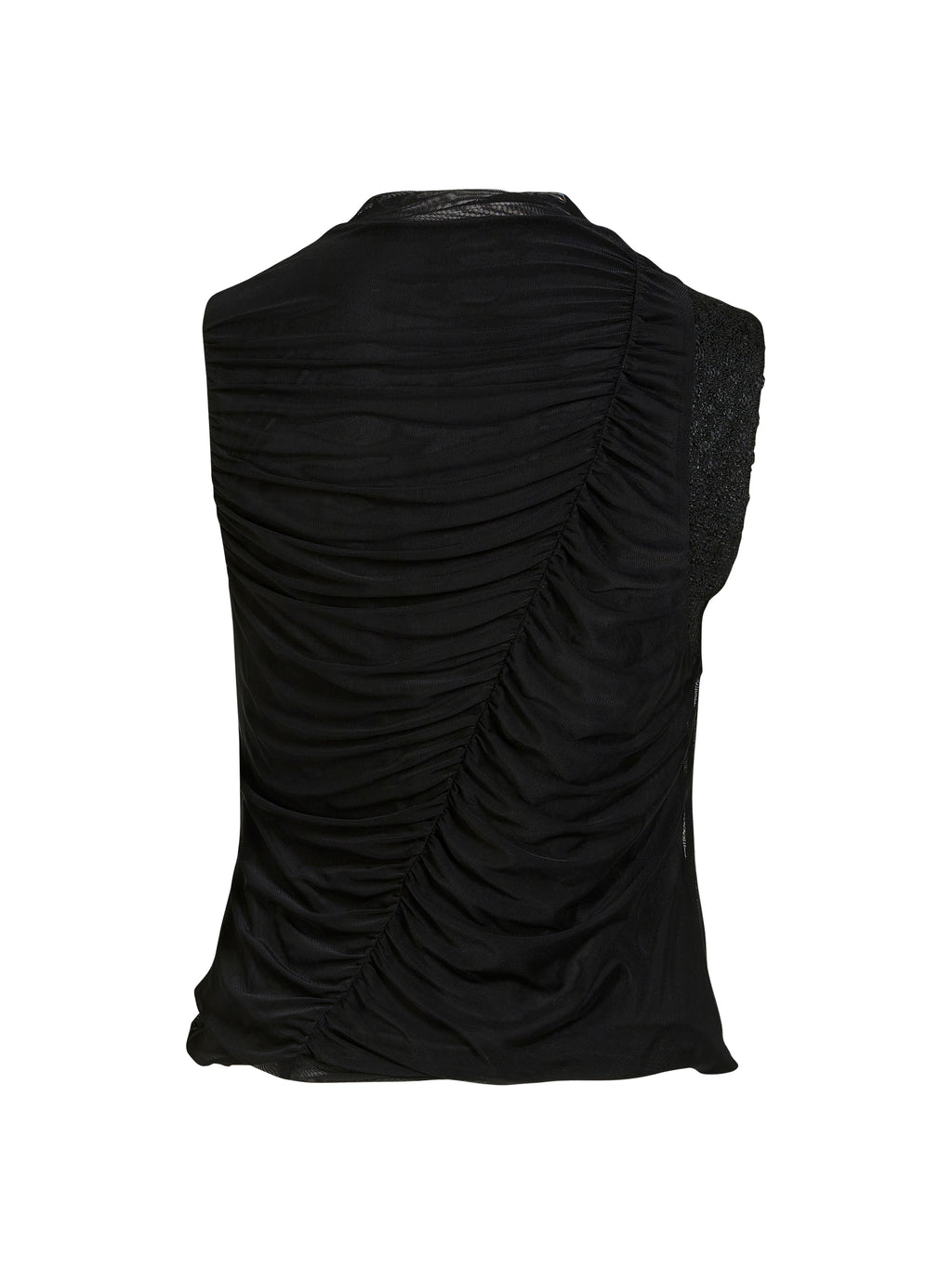 A modern twist on the classic top - this sleeveless style stands out with its bold, diagonal ruched design both in the front and back. A shiny detail at the neckline adds edge, while the lightly sheer mesh structure gives a sophisticated look. The form-fitting silhouette makes it ideal under a blazer or on its own as a statement piece.