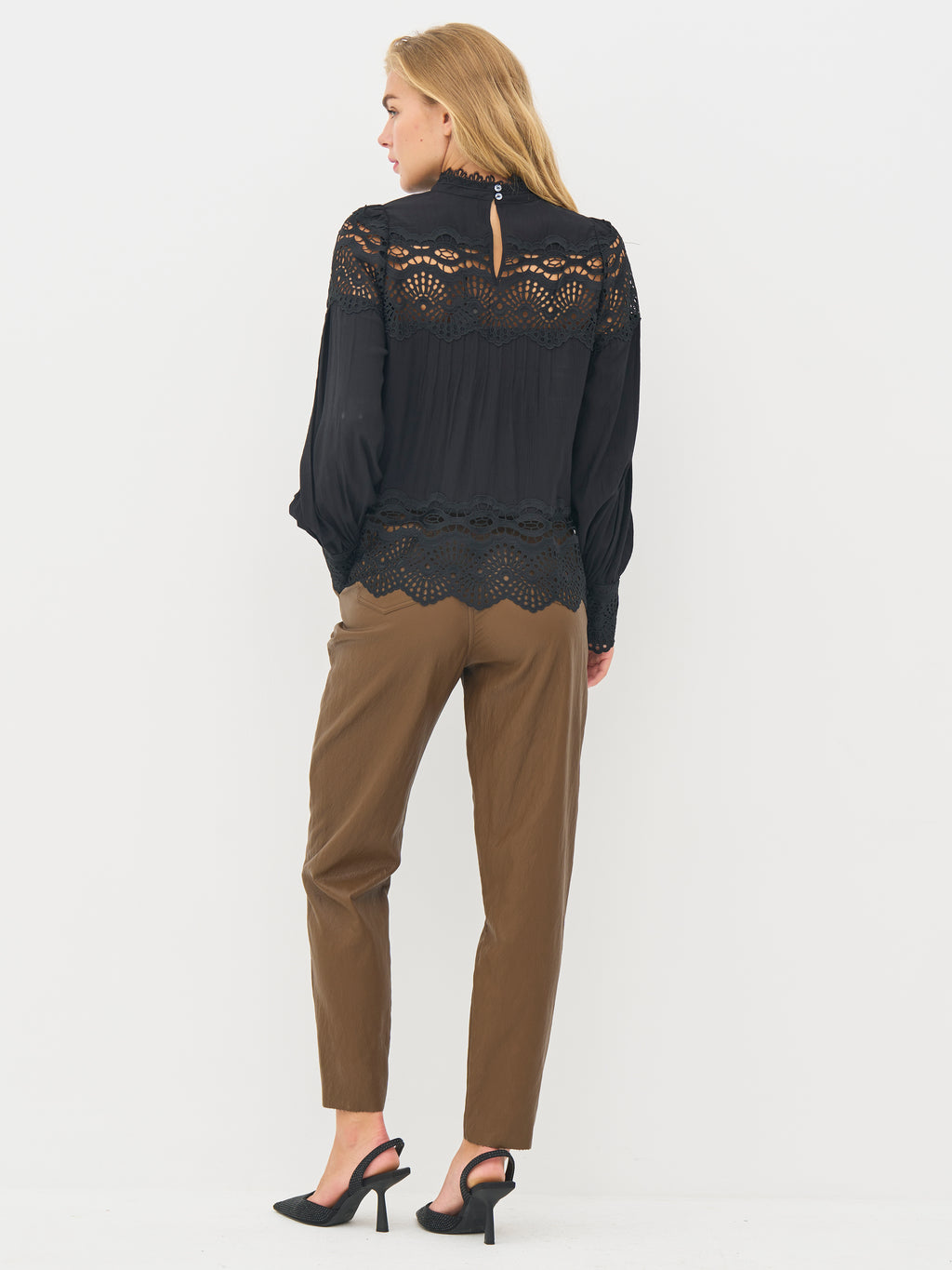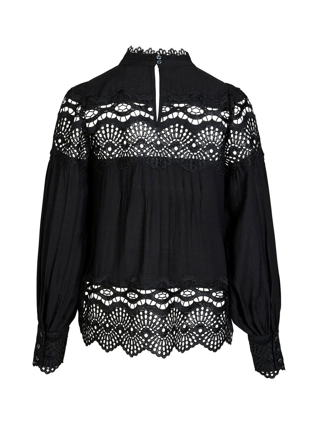 Get a refined and romantic expression with this beautiful shirt that combines classic cuts with decorative lace details. The broad lace ribbons adorn both the chest, back, cuffs, and hem, creating an elegant interplay between transparency and density. The small stand-up collar and button closure at the back add a stylish finish.