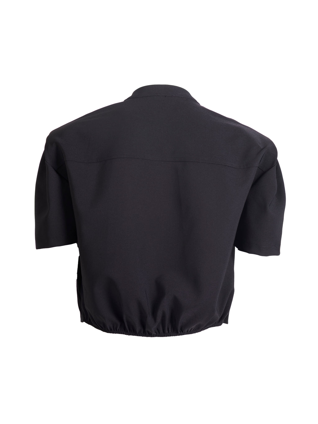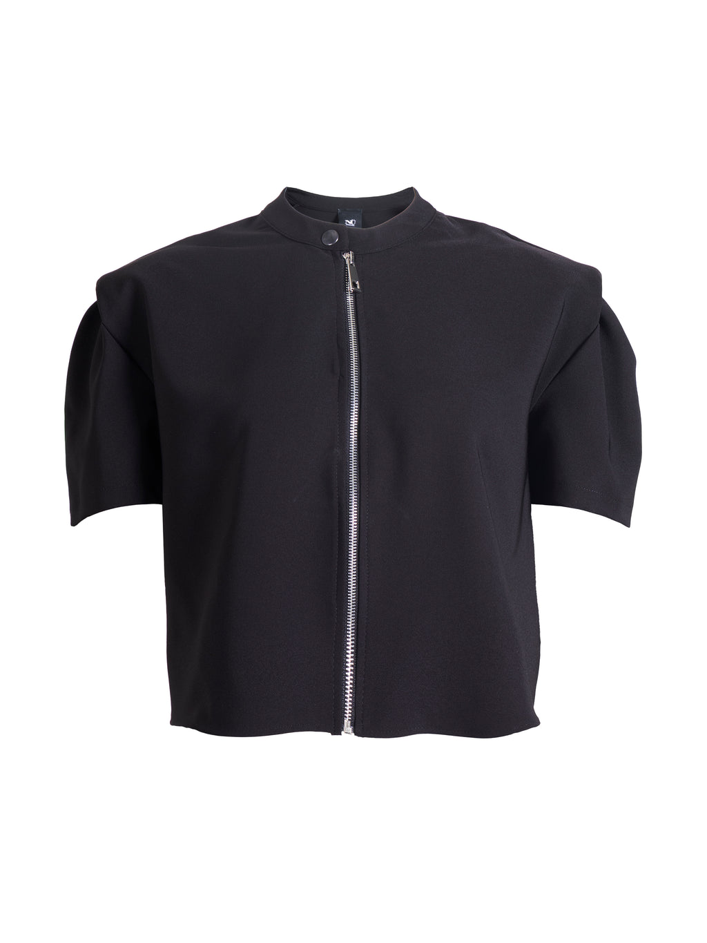 Give your outfit a modern twist with this short bolero jacket that combines structure and simplicity. The jacket features short, subtly defined sleeves and a full-length zipper at the front, adding a cool and sleek expression. The elastic hem at the bottom creates a slightly rounded fit, making it both comfortable and flattering.