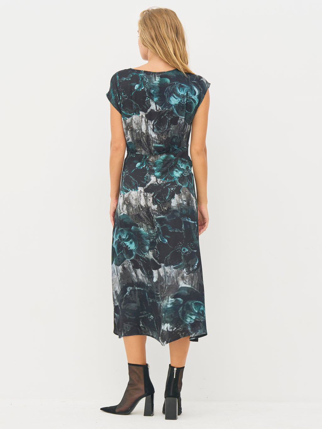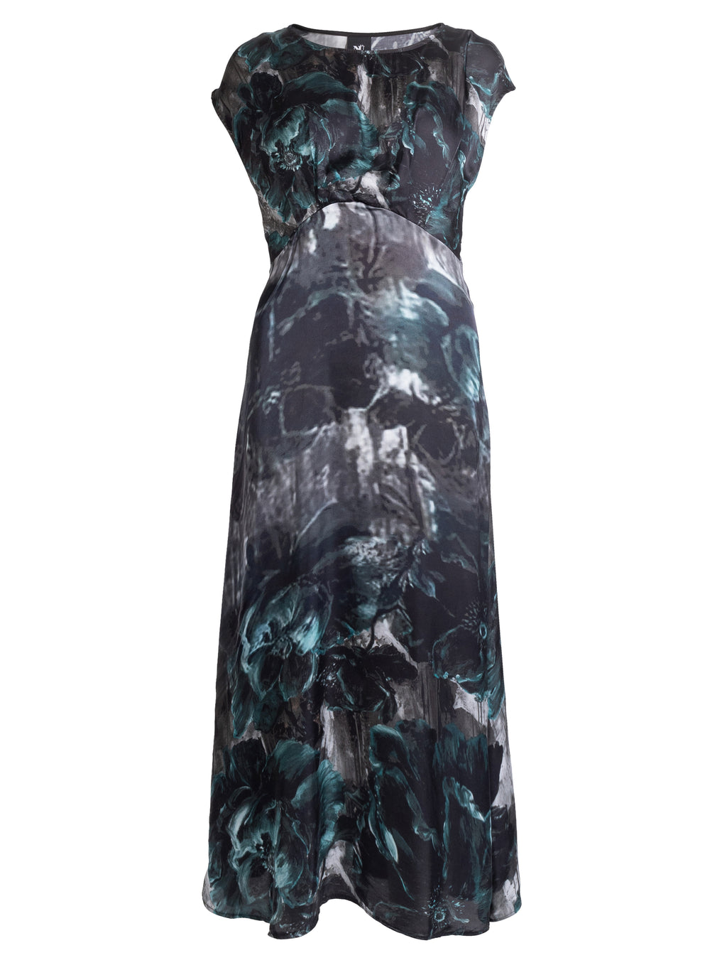 An elegant choice for both everyday wear and festive occasions. This long dress has a beautiful drape and a feminine cut with a lightly defined waist. The soft fabric follows the body in a flattering way, while the eye-catching floral print adds depth and character to the design. The short sleeves and round neckline provide a simple and timeless expression.