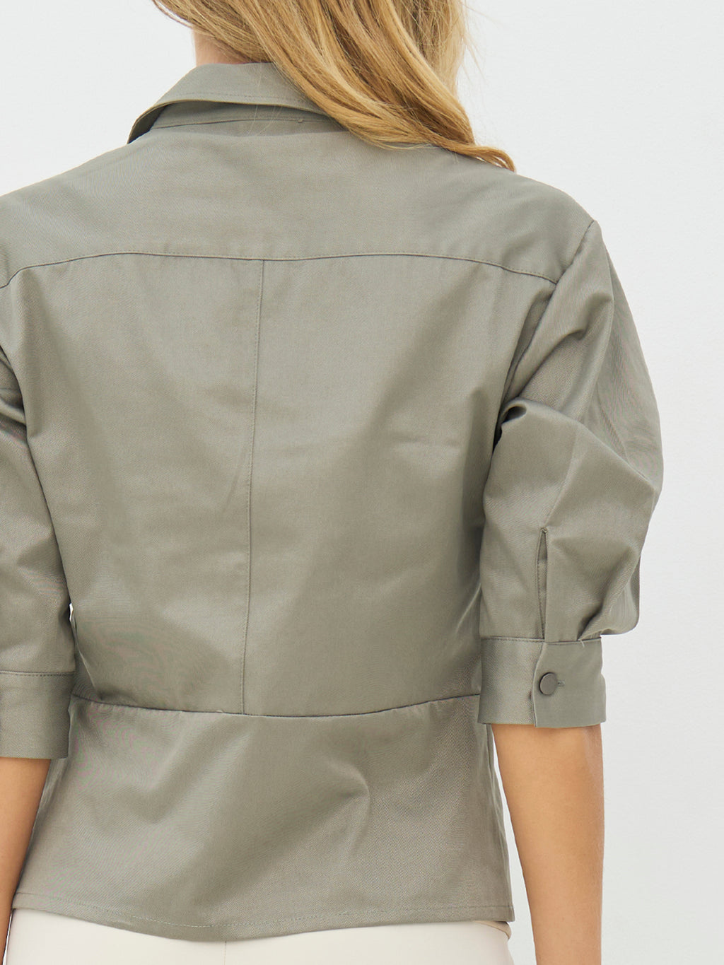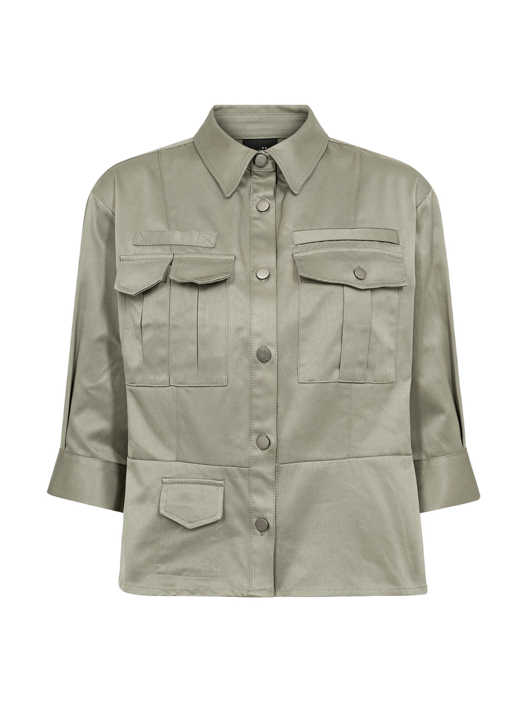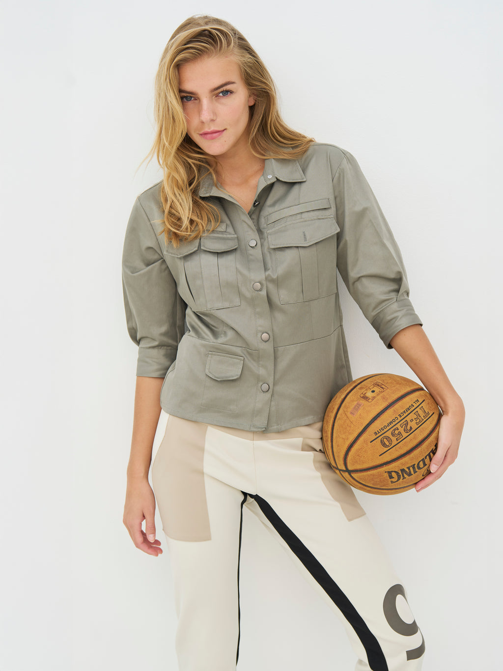 This shirt jacket has a relaxed and functional look, making it easy to wear as a light layer in everyday life. In the front, it features snap buttons and multiple pockets, giving it a practical yet edgy look. The 3/4 length sleeves contribute to a light and casual look, while the back is kept simple and falls nicely along the spine. Style the shirt jacket over a dress, or pair it with a top and pants or jeans for a casual everyday look.
