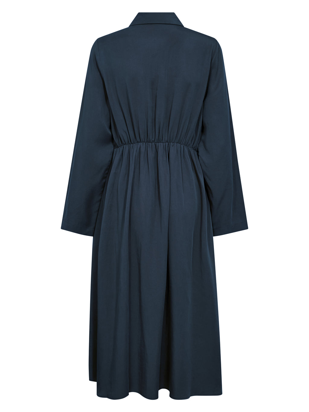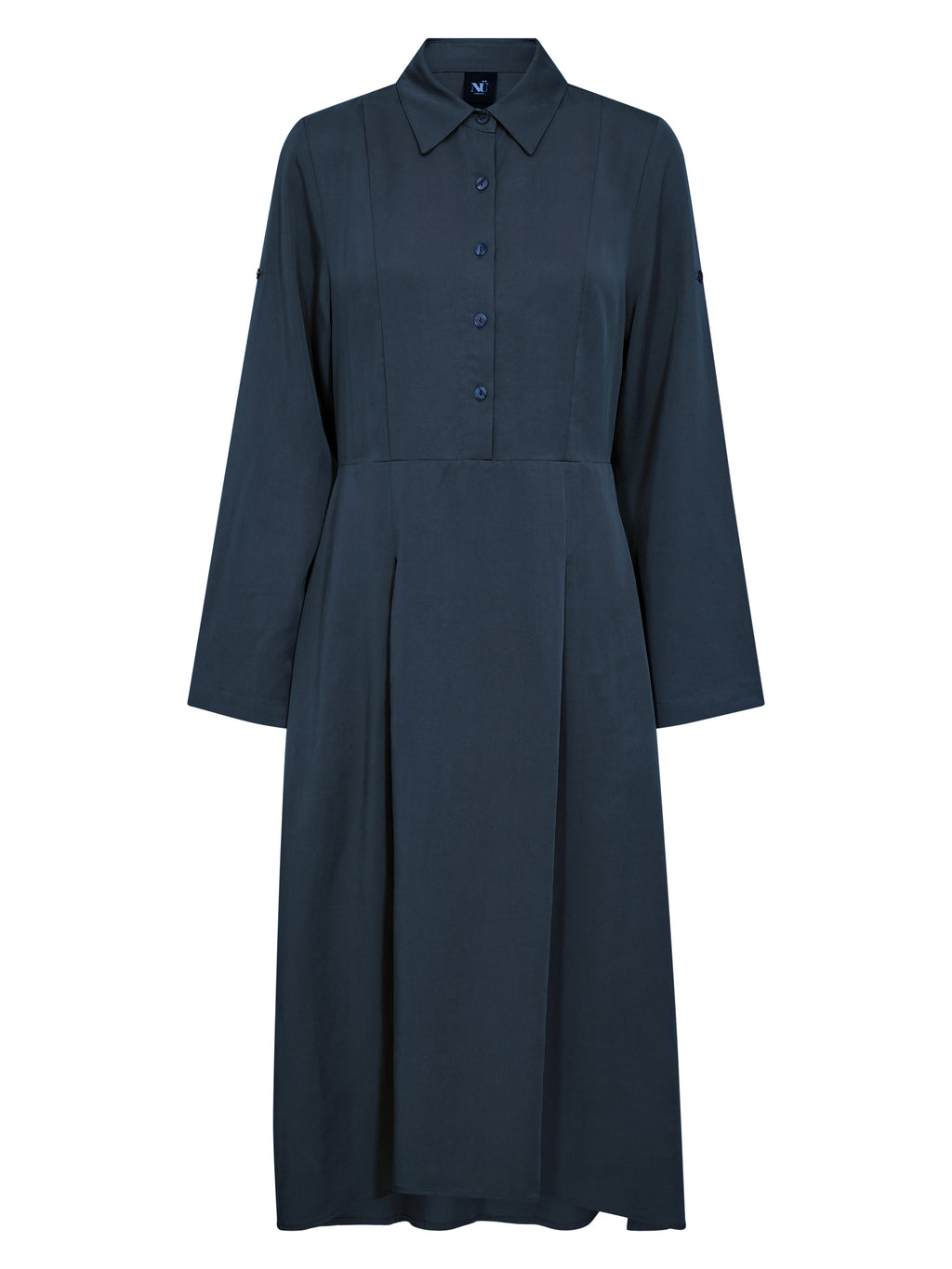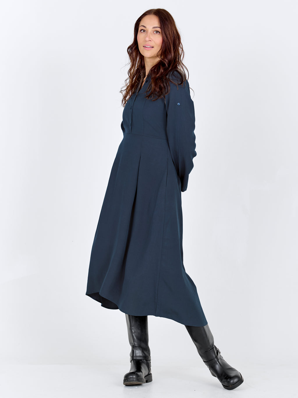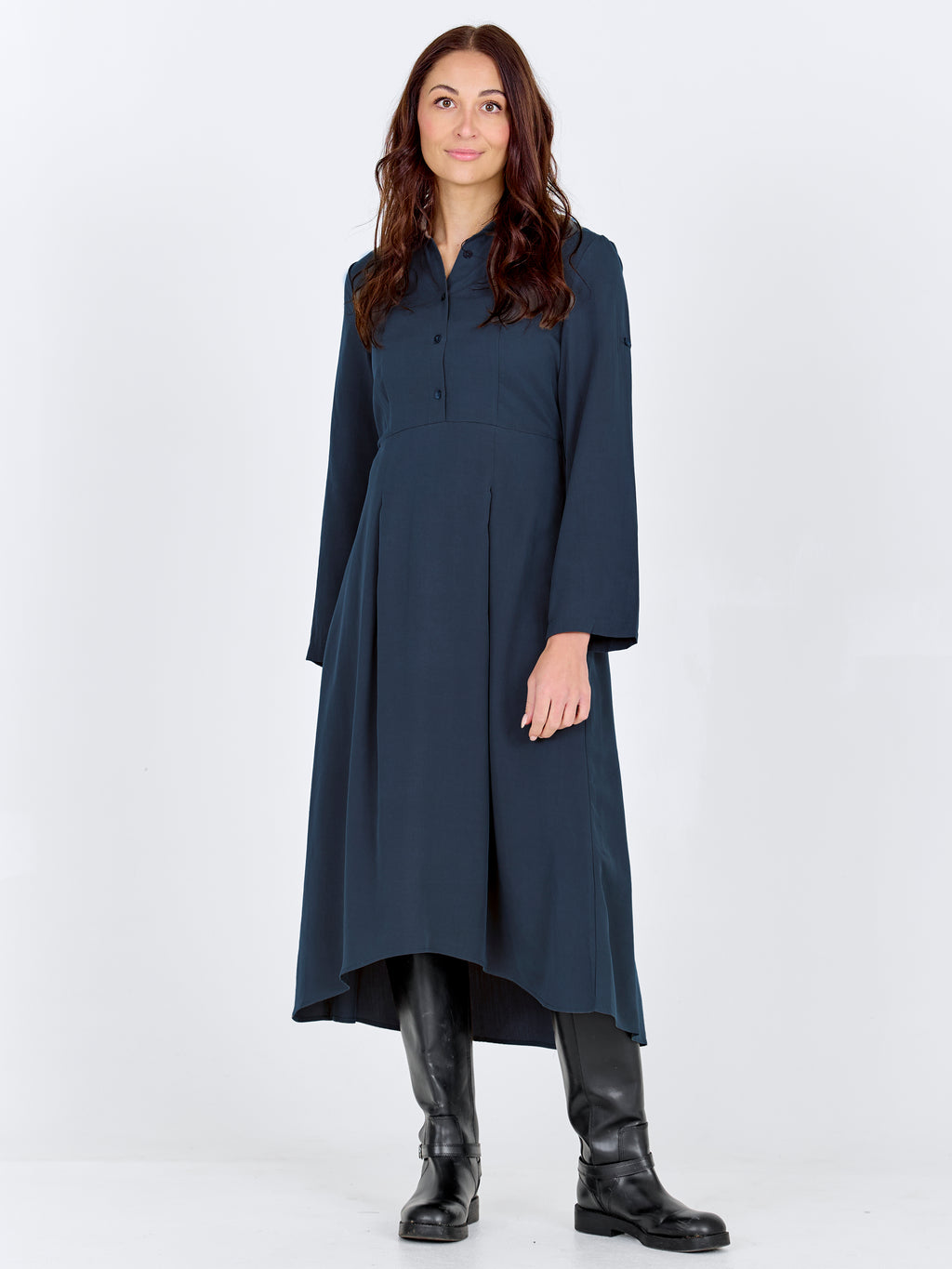 This dress has a simple and timeless look with its shirt collar, button closure, and clean lines. In the front, it has fine pleats that create a gentle flow in the skirt, while the elastic at the back ensures a comfortable and well-fitting silhouette. The long sleeves complete the design and make the dress ideal for both everyday wear and more formal occasions. Style it with boots for a modern look or with flat shoes for a more relaxed appearance.