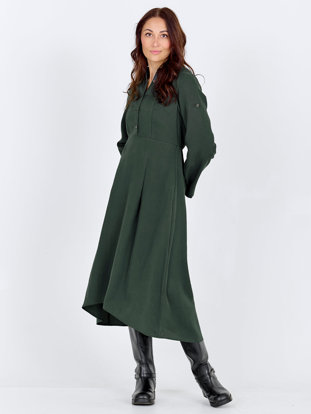 This dress has a simple and timeless look with its shirt collar, button closure, and clean lines. In the front, it has fine pleats that create a gentle flow in the skirt, while the elastic at the back ensures a comfortable and well-fitting silhouette. The long sleeves complete the design and make the dress ideal for both everyday wear and more formal occasions. Style it with boots for a modern look or with flat shoes for a more relaxed appearance.