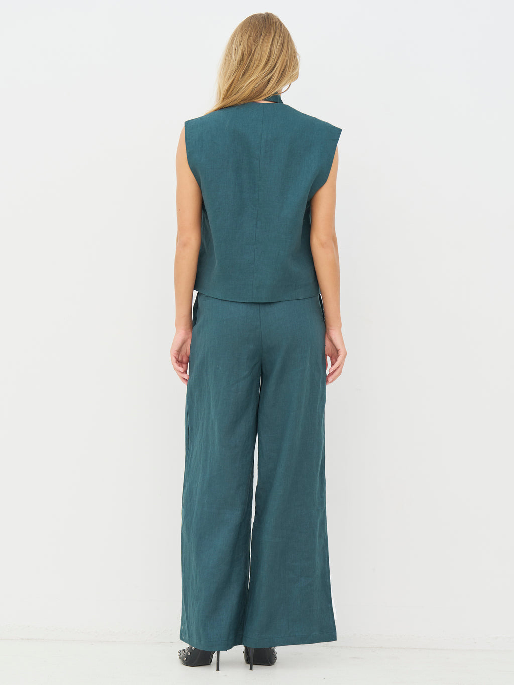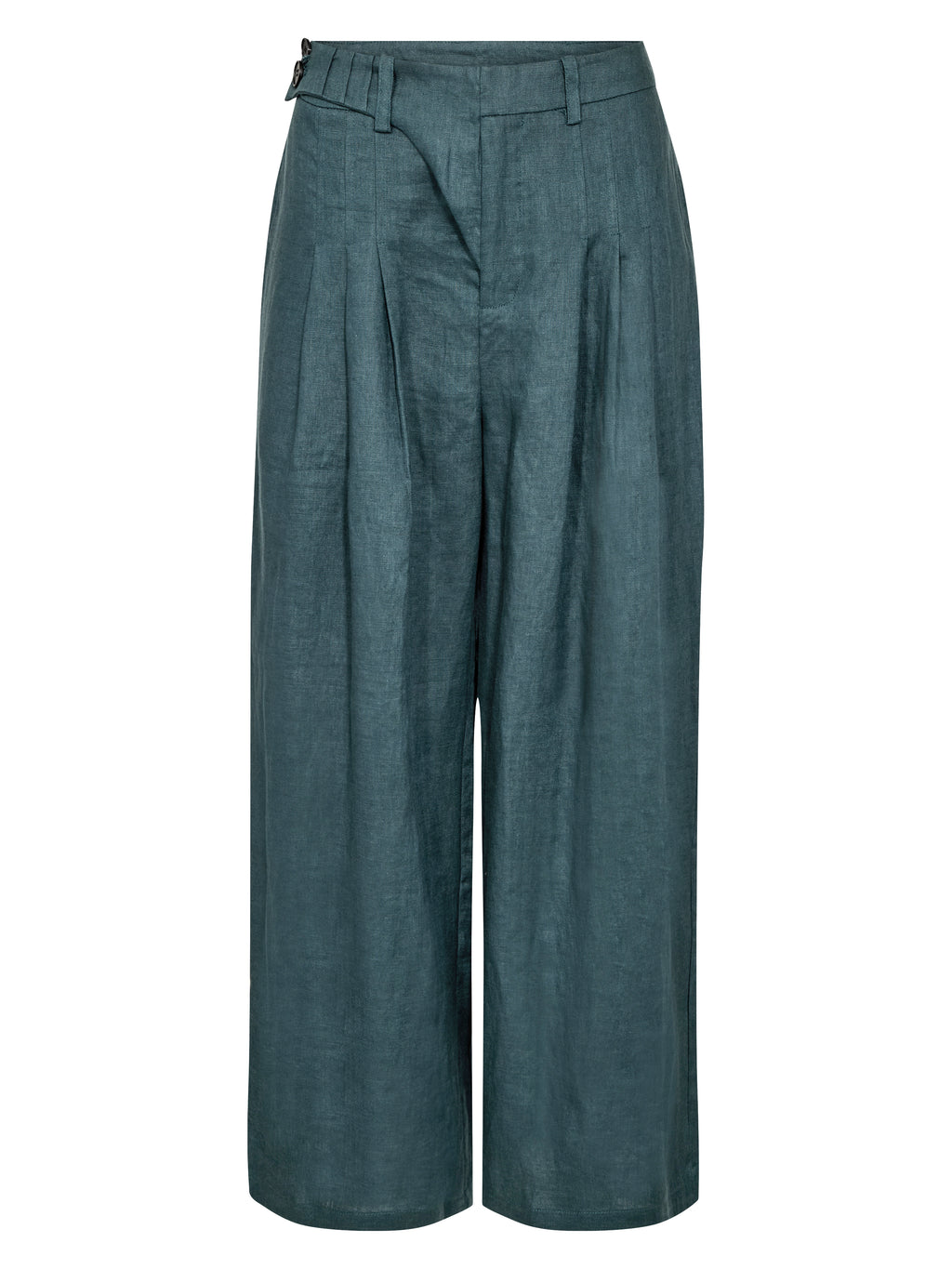 These pants are made of 100% linen and have a straight fit with wide legs, creating a light and elegant drape. They feature fine pleats at the front that add shape and a bit of extra width to the pants, while being simpler in appearance at the back. The linen quality makes the pants comfortable to wear and suitable for both warm days and more sophisticated looks.