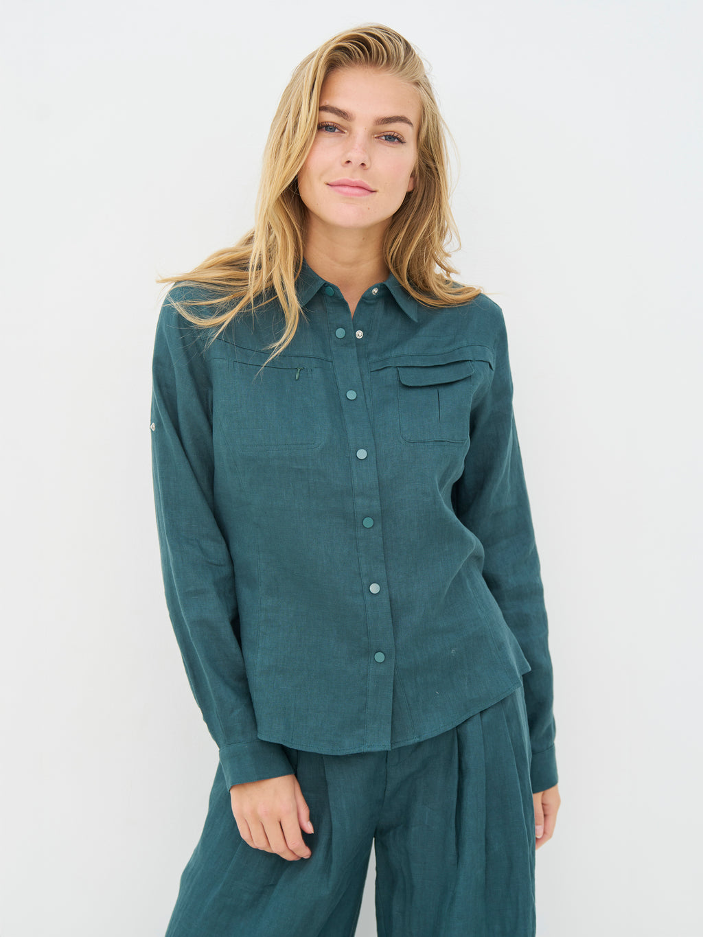 This shirt has a simple and stylish look with a classic collar and snap buttons at the front. The chest pockets add a discreet, functional element, while the back is more plain and falls nicely down the back. The fit is straight and comfortable, making the shirt easy to wear both closed and open. Style it with the matching trousers for a coordinated look, or pair it with jeans for everyday wear.