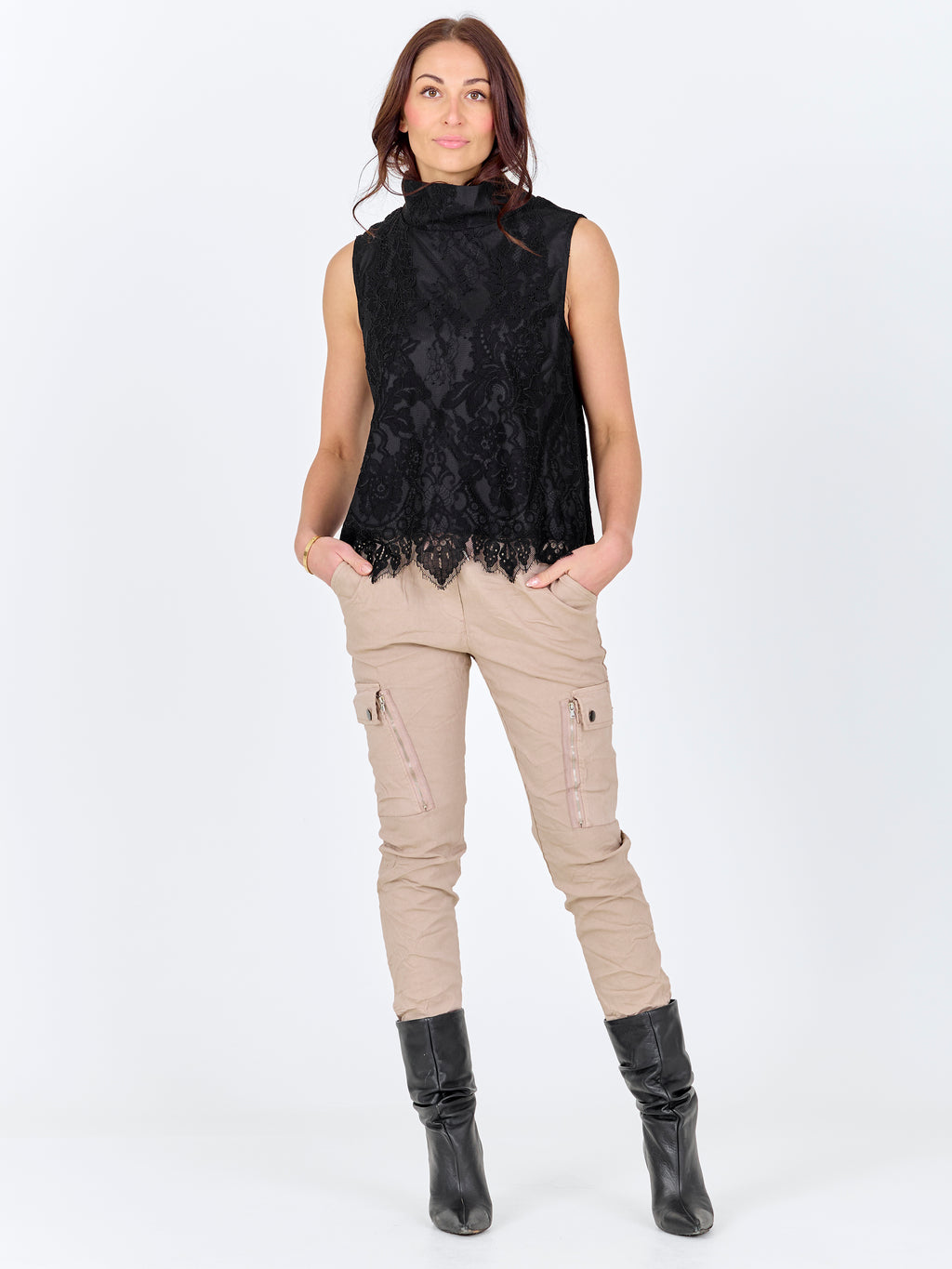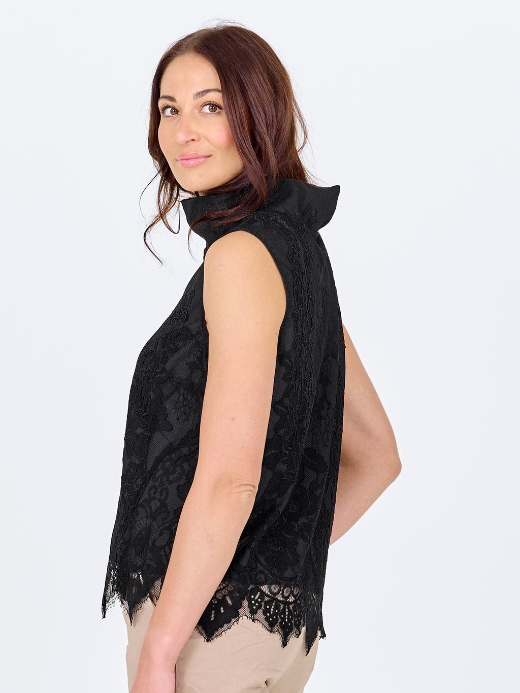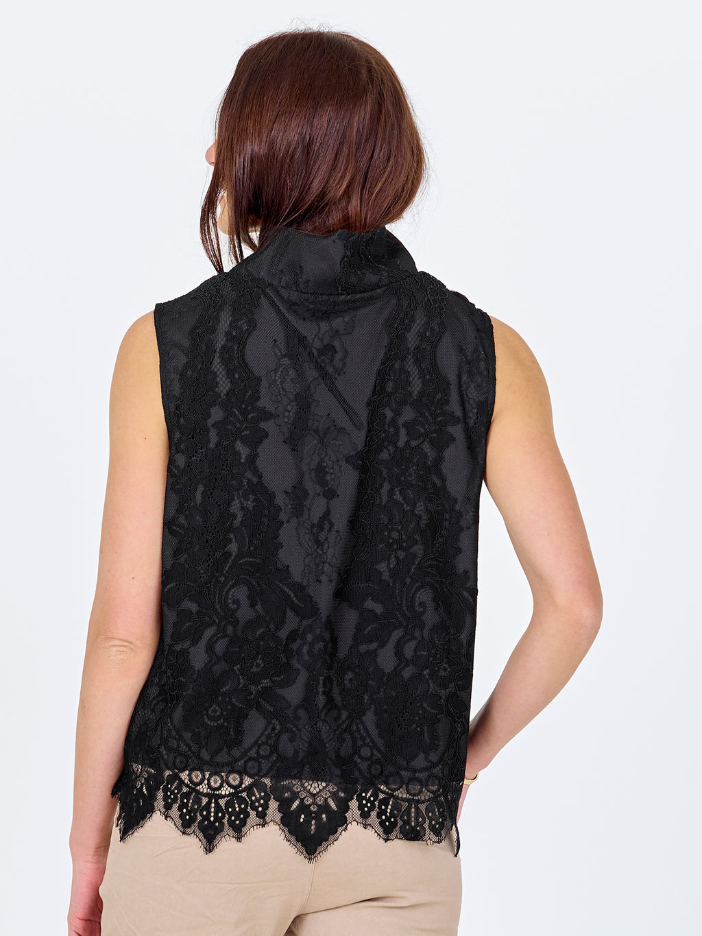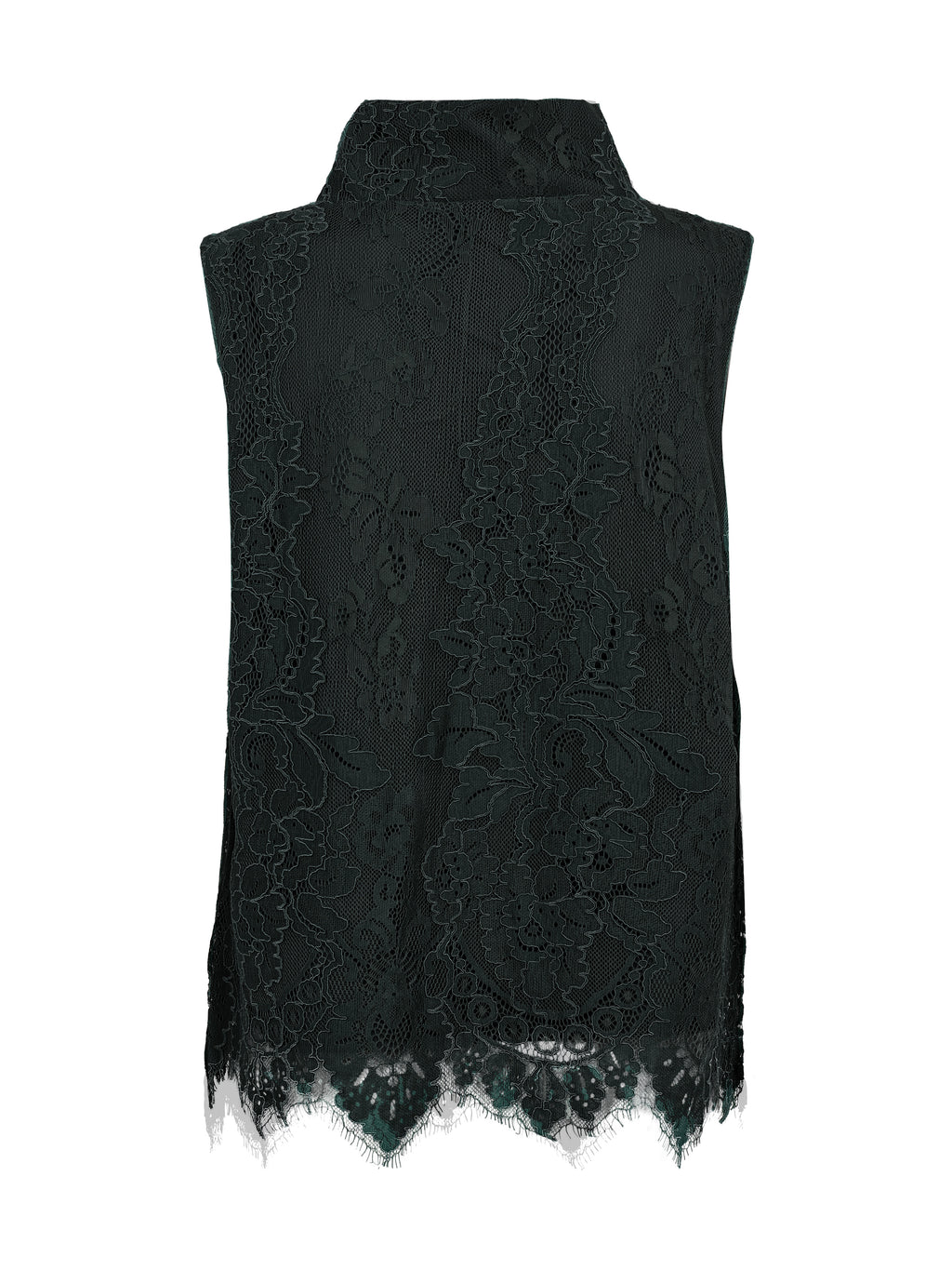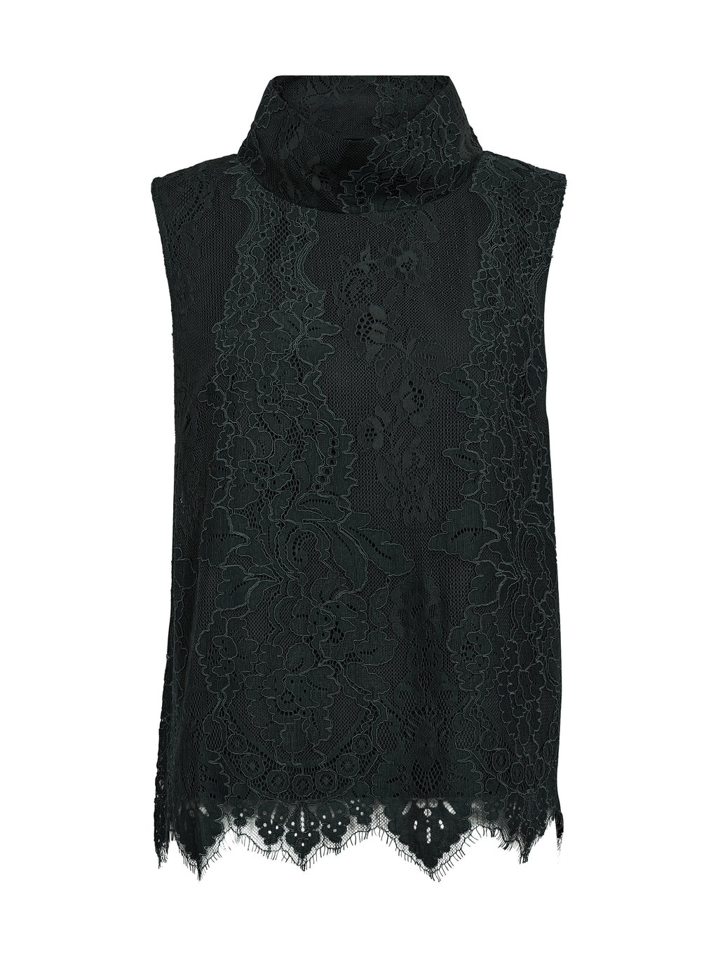 This top is made of lace fabric and has a feminine look with a high neck and sleeveless cut. The lace gives a subtle play on the surface, while the bottom edge is gently wavy and finishes the design in a nice way. The expression is consistent at the front and back, allowing the top to fall smoothly and lightly around the body. It is easy to style the top for both everyday wear and more festive occasions. Style the top with a pair of trousers, a skirt, or under a jacket or blazer.