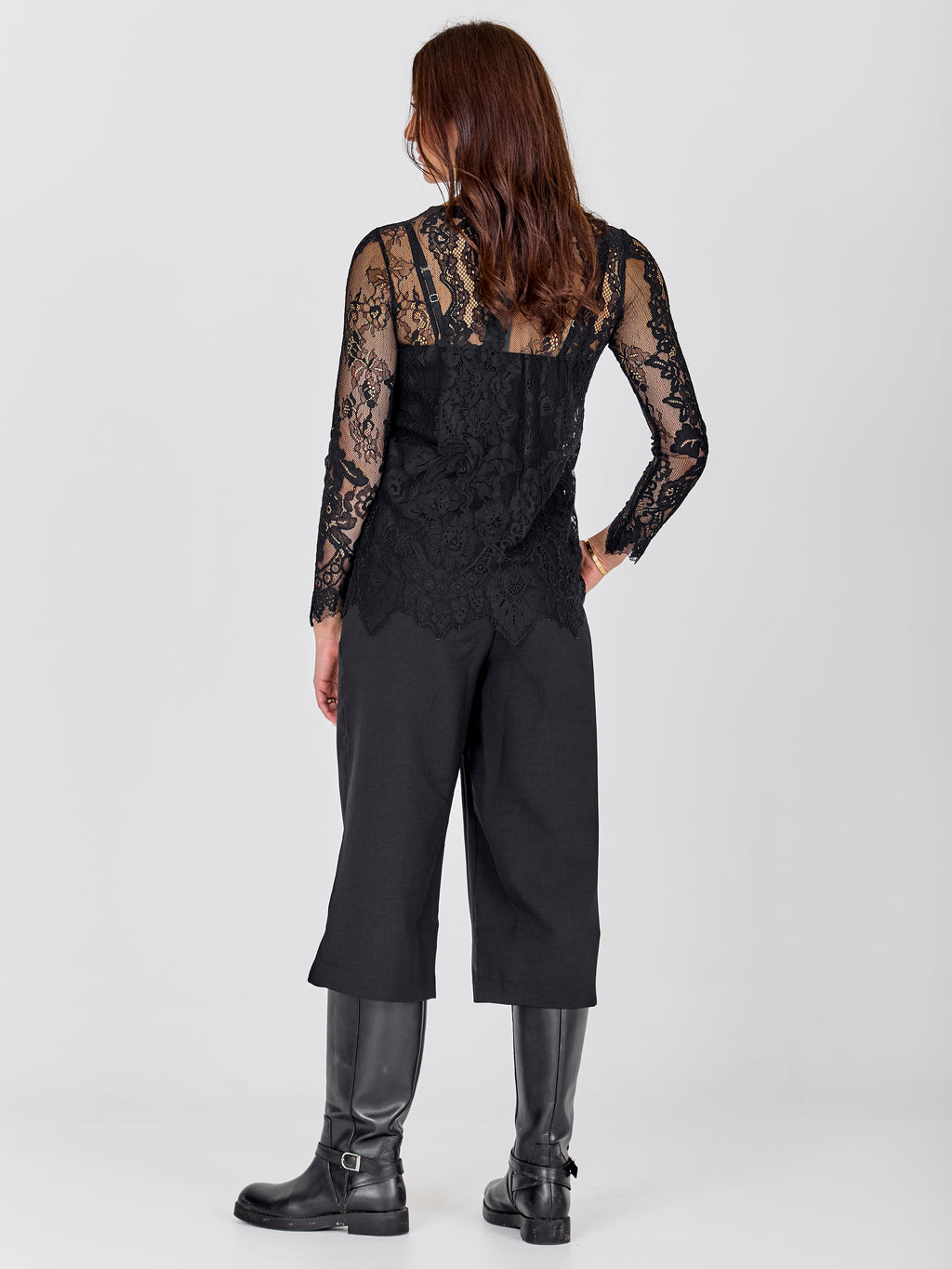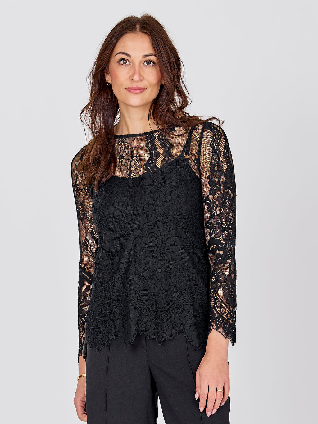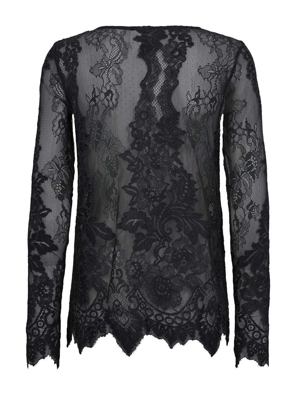 This lace blouse has a feminine and elegant look with transparent lace and a distinct floral pattern. The lightweight material adds depth to the look and works beautifully as a layer over a simple top. The edges are finished with a slight wavy edge, providing a neat and polished finish. The blouse is comfortable to wear and can be styled for both casual and more festive occasions - alone or under a blazer or knitwear.