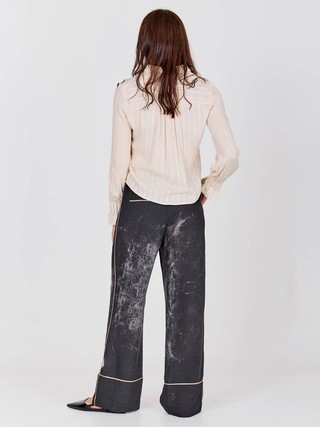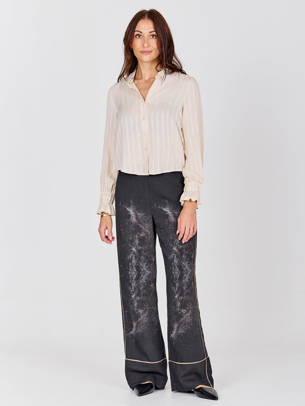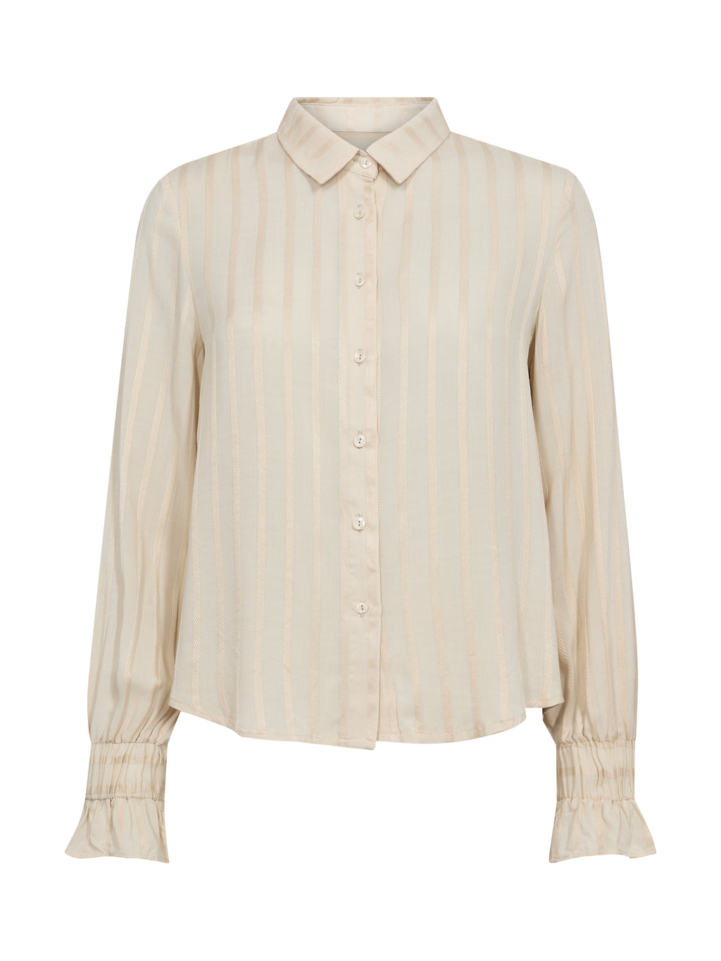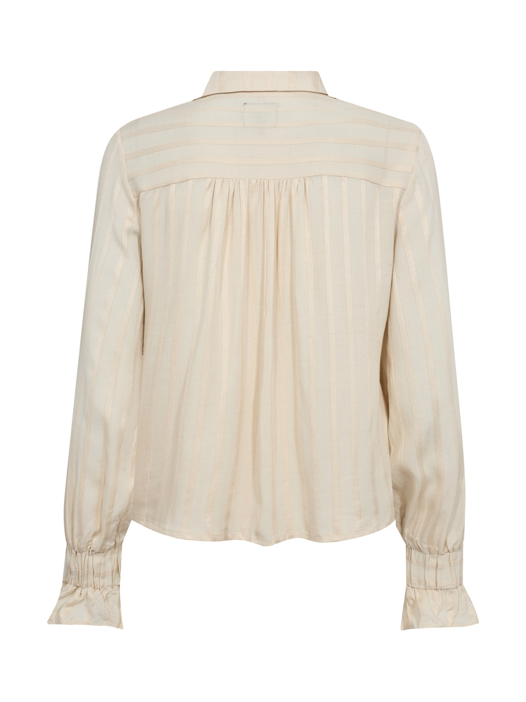 This shirt has a light and feminine expression with a classic collar and button closure at the front. The discreet stripes give the fabric depth, while the long sleeves are finished with elastic at the cuffs, creating a soft and comfortable fit. The front design is simple, and at the back, the shirt falls gently along the back. It is easy to style both closed and slightly open - perfect for both everyday wear and more formal occasions.
