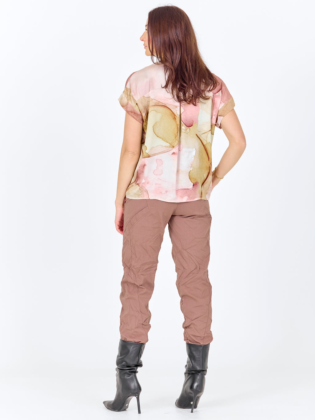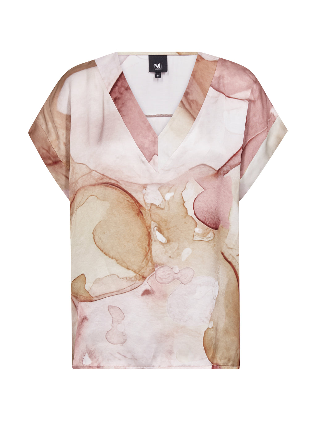 This blouse has a simple cut with a V-neckline and short sleeves, giving a relaxed and versatile look. The print is both on the front and back, adding character and edge. The fit is straight, so the blouse falls nicely on the body and is easy to style with both pants and shorts. Wear it alone for everyday use or with a light jacket for a complete look.