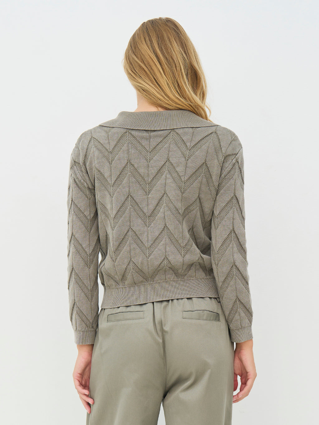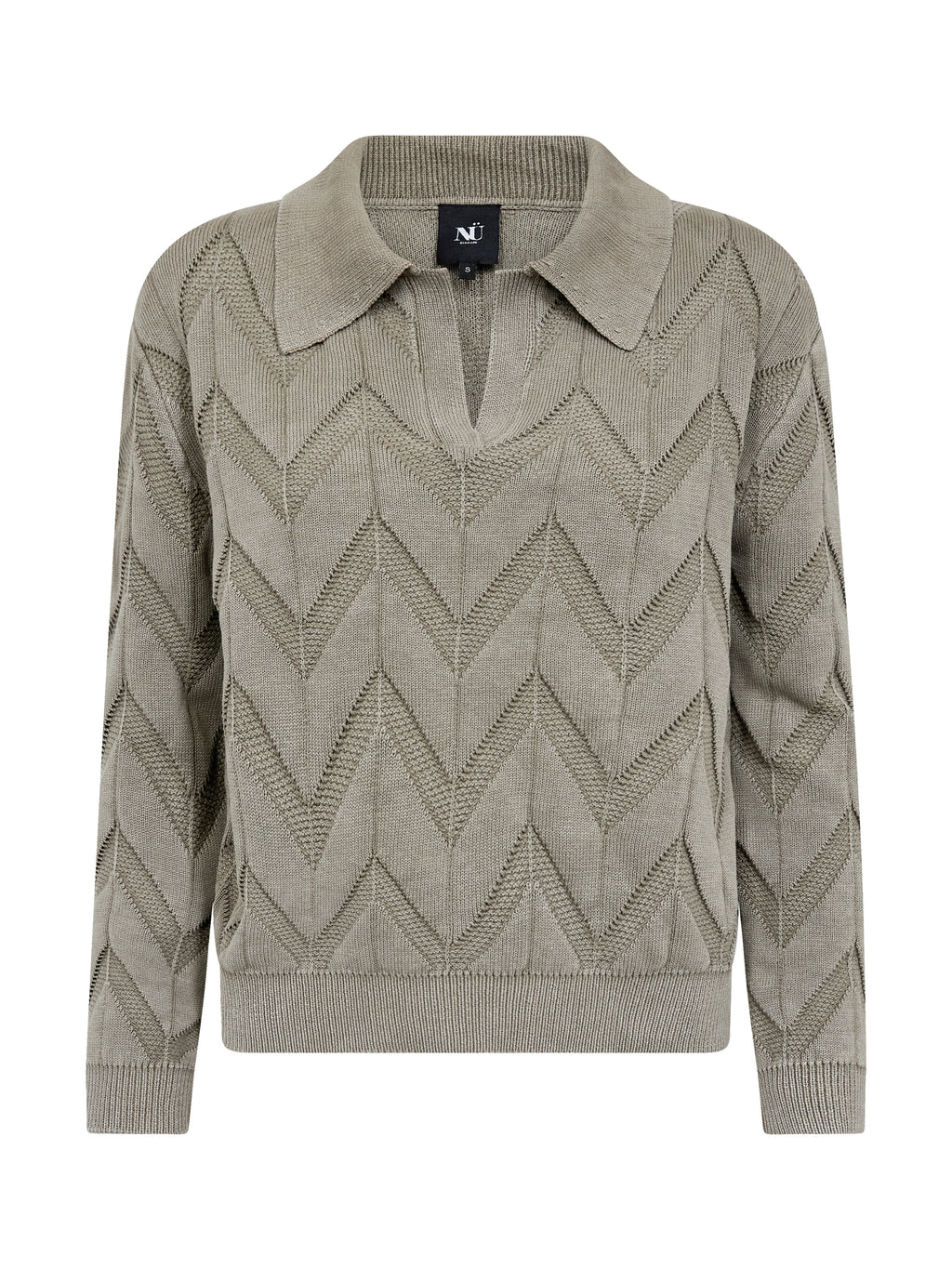 This knitted sweater has a relaxed and feminine look with long sleeves and a polo collar, giving a subtle lift to the classic cut. The front features a short V-neck cutout, while the continuous zigzag pattern creates structure and liveliness in the design. The back follows the same pattern. Style the sweater with a pair of classic pants or a skirt for an everyday look that feels both dressed up and relaxed.